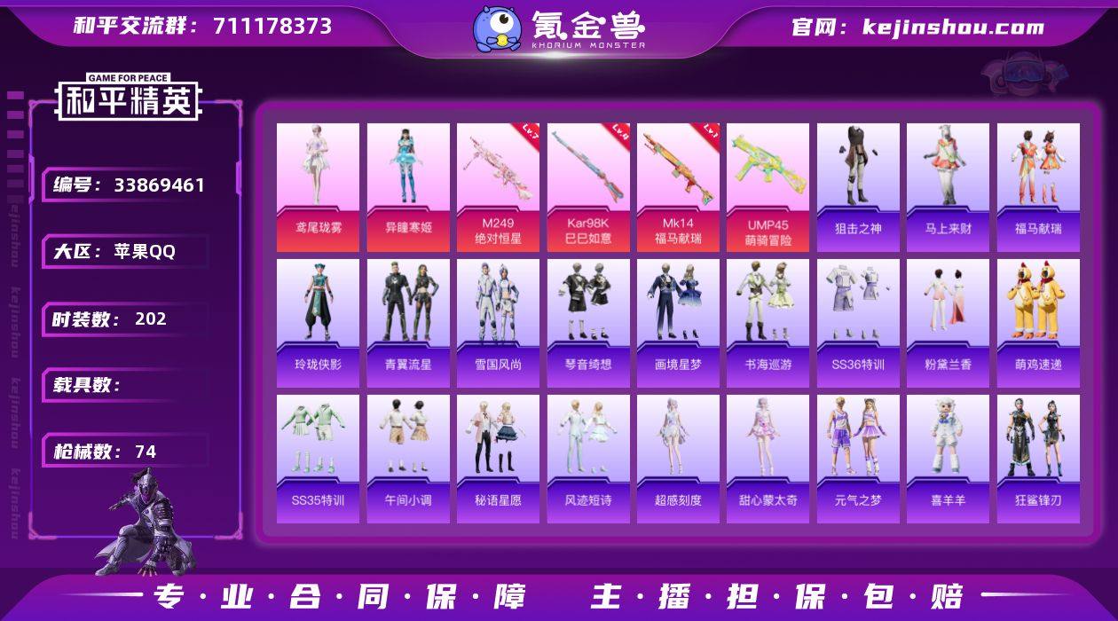 实名: 可修改 时装数: 202 枪械数: 74 热门装扮: 梦魇先生,鹰眼刺客,异瞳寒姬,鸢尾珑雾 稀有枪皮: Kar98K-巳巳如意,M249-绝对恒星,MK14-福马献瑞,UMP45-萌骑冒险 亮点: 【优质装备】:七级M249-绝对恒星