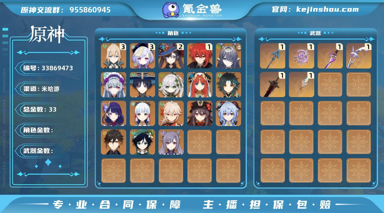 邮箱: 未绑定 总黄数: 33 冒险等级: 57 3命金色角色: 三命七七,三命琴 2命金色角色: 二命莫娜 1命金色角色: 一命迪卢克 0命金色角色: 温迪,枫原万叶,神里绫华,刻晴,钟离,甘雨,魈,胡桃,雷电将军,妮露,纳西妲,流浪者,梦见月瑞希,菈乌玛 1精武器: 狼的末路,雾切之回光,阿莫斯之弓,天空之脊,不灭月华,息灾