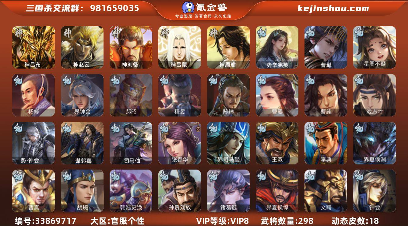 【14790427】官阶:骠骑将军;VIP等级:VIP8;史诗武将数量:31;动态皮肤数量:18;武将总数:298;史诗宝珠数量:0;将魂数量:2336;神将:3;魏国史诗武将:6;蜀国史诗武将:7;吴国史诗武将:1;群史诗武将:10