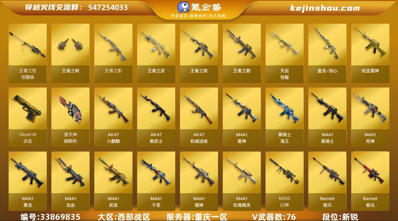 重庆一区-80V-10王者武器数-1炫金武器数 【热门武器】:QBZ03-金色蔷薇*2,M200-幻神,死亡之眼*2,Kar98K-星神,M4A1-黑骑士*3,汤姆逊-烈龙*6,加特林-炼狱,斯泰尔-蝴蝶,沙鹰-修罗*5 【王者炫金武器】:王者之戮,天启-悦智,王者之势,王者之武,王者之影,盘龙-悦心*3,王者之刺,炫金雷神 【音效卡】:AK47-火麒麟音效卡,M4A1-雷神音效卡,M4A1-黑骑士音效卡,Barrett-毁灭音效卡,Kar98K-星神音效卡 【皮肤】:幻神-星耀 皮肤,星神-傲竹金蛇 皮肤,雷神-暗月,雷神-星空,火麒麟-雷神,毁灭-暗月,毁灭耀金皮肤,毁灭-冠军之怒,黑龙-暗月,无影-暗月*3,天启-暗月,极光-能量核心*2,天神-暗月*2 【角色】:零,樱,瞳,堕落女神,北极狐-X,娟娟,兰-海滩派对,零-水下丽影,灵狐者-X,灵狐者-黄金海岸,潘多拉-X,铁骑荣耀,新娜塔莎,影武者-X 【人偶武器】:斯泰尔-蝴蝶,M37-葵,COP-旗袍,迷你深渊冰龙,迷你生化手雷 【暴走生化】:死亡之眼*2 【挑战大师】:冰龙粉碎者-白马银枪,神圣爆裂者-末日III 【英雄级武器】:M4A1-千变*2,AK47-火麒麟*2,M4A1-黑龙*2,M4A1-雷神*5,M4A1-黑骑士*3,M4A1-死神,AK47-黑武士*2,AK12-天启,AN94-超新星,M4A1-武圣...