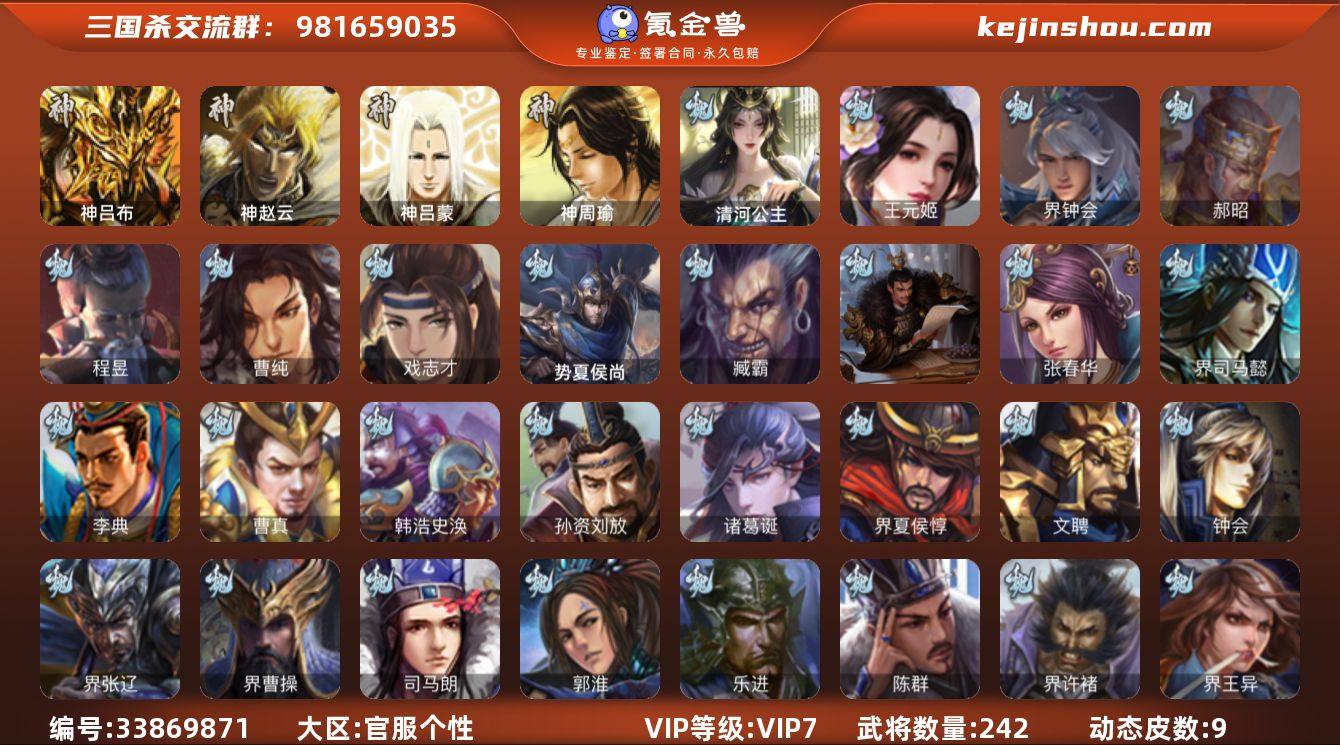 【14790429】官阶:骠骑将军;VIP等级:VIP7;史诗武将数量:20;动态皮肤数量:9;武将总数:242;史诗宝珠数量:9;将魂数量:1705;神将:2;魏国史诗武将:6;蜀国史诗武将:3;吴国史诗武将:3;群史诗武将:5