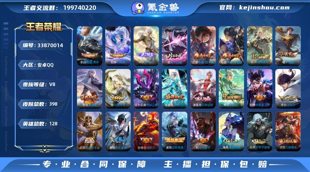 【王者荣耀】珍品无双0 典藏2 无双1 珍品传说1 传说18 史诗110 英雄128 皮肤398 贵族8级 荣耀典藏:幻阙歌|鸣剑·曳影__无双皮肤:碎月剑心__珍品传说:朽木白哉__传说皮肤:鸣野蒿|孙尚香-异界灵契|绛天战甲|炽阳神光|启明星使|地狱之眼|地狱火|仲夏夜之梦|云霓雀翎|黄金射手座|李逍遥|凤求凰|诗剑行|时雨天司|武陵仙君|神树通天|神骥·越千峰|神骥·逐星野__稀有限定:至尊宝|蔷薇恋人|孙行者|猪悟能|李小龙|梁祝|狮舞东方|拒霜思|暗影游猎|白昼王子|百解令|冰锋战神|冰霜恋舞曲|大漠名商|地狱燃心|繁星吟游|凤凰于飞|高山流水|古海寻踪|海滩派对|海盐诗旅|航海奇遇记|胡桃异想国|华丽摇滚|皇家上将|混沌棋|剑破天穹|江河有灵|金庭之子|凯尔特女王|炼金王|魔术师|千军破阵|擒涛扼浪|穷奇|驱傩正仪|燃音魔法|荣光圣徽|沙漠行僧|朔风刀|死亡摇滚|探海日志|饕餮|醍醐杖|天穹祈灯|万华元夜|妄想食味|无心|五谷丰年|纤云弄巧|演武夺筹|疑决卦|阴阳师|优雅恋人|游园惊梦|驭风魔法|遇见飞天|御旌|御銮|御狮|云间偶戏|真爱魔法|暗夜贵公子|暗隐猎兽者|暗渊魔法|白蛇|缤纷独角兽|冰冠公主|冰雪圆舞曲|苍穹之光|乘风破浪|大乔-猫狗日记|德古拉伯爵|地狱岩魂|电玩·爆裂旋风|电玩小子|功夫厨神|...