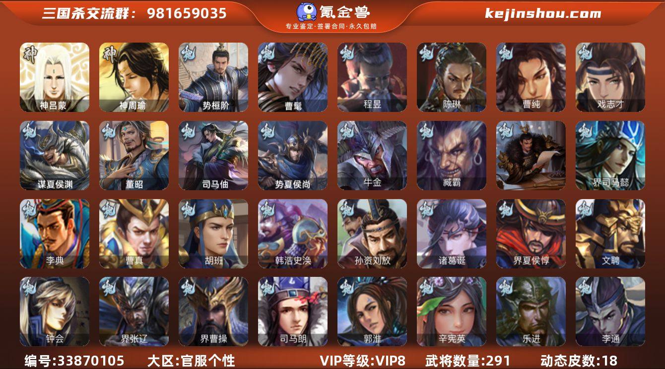 【14790431】官阶:骠骑将军;VIP等级:VIP8;史诗武将数量:22;动态皮肤数量:18;武将总数:291;史诗宝珠数量:0;将魂数量:415;神将:0;魏国史诗武将:0;蜀国史诗武将:5;吴国史诗武将:1;群史诗武将:10
