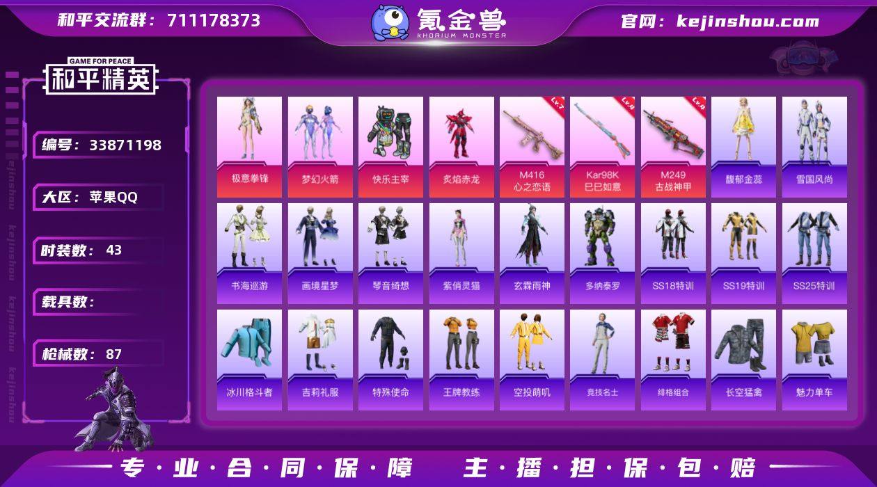 【特价出售】【永久包售后!!!】苹果 手Q-4粉装-3特效枪-0载具-1粉色飞行器-24520热力值-1王牌印记-43套装-87枪皮 【热门品类】:粉装-梦幻火箭 【粉色套装】:粉装-快乐主宰,粉装-梦幻火箭,粉装-炙焰赤龙,粉装-极意拳锋 【粉色枪皮等级】:M416-心之恋语(七级),Kar98K-巳巳如意(四级),M249-古战神甲(四级) 【粉色枪皮】:M416-心之恋语,Kar98K-巳巳如意,M249-古战神甲 【粉色飞行器】:炫彩糖果飞行器 【粉色降落伞】:绝对恒星降落伞,梦幻火箭降落伞,神秘黑猫降落伞,未来歌姬降落伞,粉樱探戈降落伞,江南烟雨降落伞,异瞳寒姬降落伞,天象三御降落伞,炫彩糖果降落伞 【稀有套装】:套装-雪国风尚,套装-炫彩糖果,角色-多纳泰罗,角色-紫俏灵猫,角色-玄霖雨神,套装-书海巡游,套装-画境星梦,套装-琴音绮想,角色-馥郁金蕊 【稀有枪皮】:AUG-冰晶雪宝,AKM-2P战斗服款,AKM-彩虹符号,AKM-龙的传人,M16A4-幻世战舞者,SCAR-L-甜蜜旋律,M416-红色方程式,M416-蓝色火焰,AUG-耀粉歌者,AUG-绝对恒星,QBZ-未来歌姬,M762-天降萌叽,M762-登顶巅峰,G36C-古战神甲,ACE32-画境星梦,UZI-啾咪啾咪,UZI-天降萌叽,汤姆逊-天降萌叽,MP5K-画境星梦,Kar98K-...