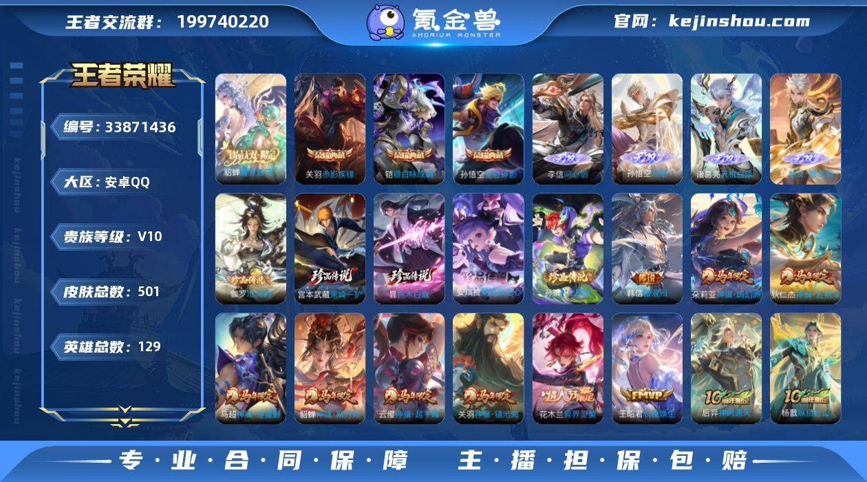 实名: 可修改 性别: 男号 贵族等级: V10 英雄数: 129 皮肤数: 501 荣耀水晶: 全息碎影,赤影疾锋,银白咏叹调 无双皮: 器灵·螭龙剑,天机白泽,无相,问心剑 珍品传说: 时之奇旅-孙策,酷洛米之心,朽木白哉,黑崎一护,沧流箭 传说皮: 黄金狮子座,黄金射手座,冠军飞将,云鹰飞将,绛天战甲,黄金白羊座,久胜战神,炽阳神光,一念神魔,云霓雀翎,末日机甲-孙尚香,地狱火,地狱之眼,飞鸢探春,胖达荣荣,乞巧织情,时之恋人-刘备,游龙清影,淬星耀世,超时空战士-狄仁杰,末日机甲-孙策,挚爱之约,无双飞将,音你闪耀,碎云,天秀幻梦,山海·炽霜斩,山海·琳琅生,画中仙,浮生妄,记忆之芯,电玩·雷克斯,鹤羽星尊,灼幽烈阳,妄想实况,惊梅引,遇见神鼓,小动物乐团,霜月吟,澜逐花归海,艾琳觅芳踪,乘龙·铭钟鼎,乘龙·淬吴钩,典韦战鼓燎原,落雪白狼,幻光神枪,祥瑞亨通,云诺千山,九山相柳,死亡执政官,千山共赴,万灵伏威,神树通天,纵目迁山,长夜焕生,神骥·赴朔漠,神骥·鸣幻洲,神骥·越千峰,神骥·逐星野,神骥·镇沧海,神骥·聚万邦,异界灵契-花木兰,踏浪归 限定皮: 御风骁将,龙胆,白鹤梁神女,辉光之辰,天狼溯光者,永曜之星,乒乒小将,冰霜恋舞曲,凤求凰,寅虎·御盾,白虎志,至尊宝,大圣娶亲,寅虎·瑞焰,孙行者,傲雪梅枪,寅虎·赤...
