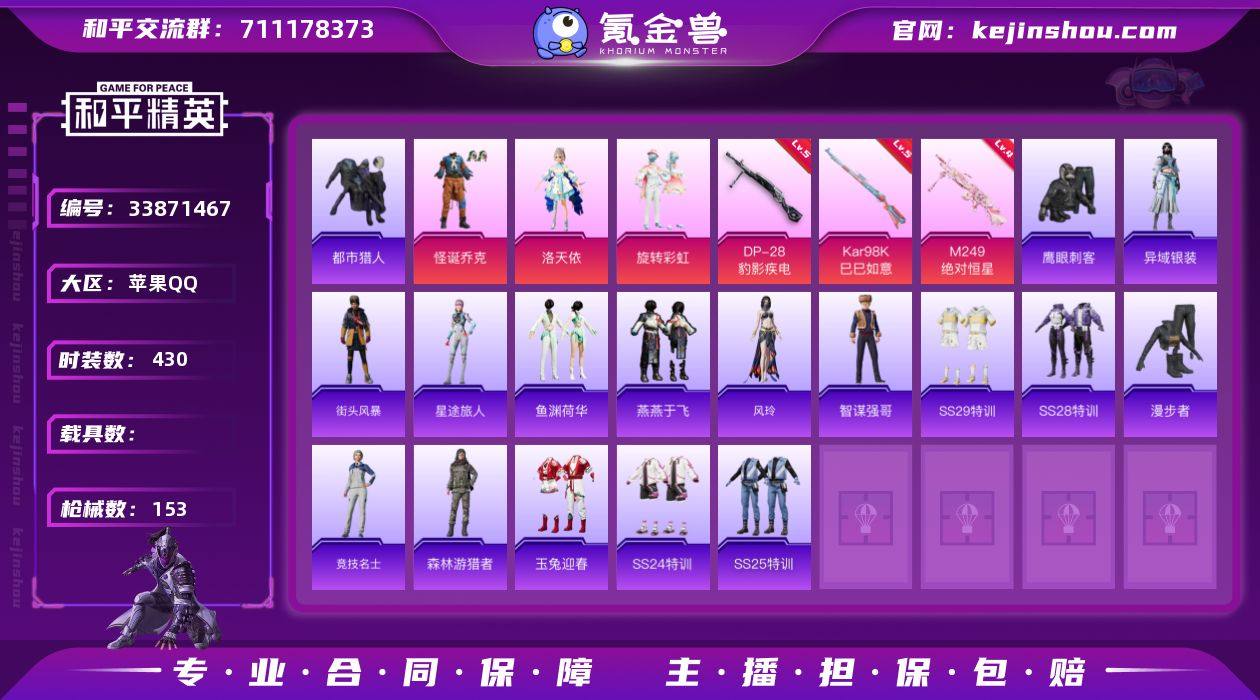 【特价出售】苹果Q-1稀有3粉装5特效枪4热门109套装153枪皮 41915热力值 8印记 历史卓越王牌17星 【1稀有】 都市猎人 【3粉装】 洛天依 怪诞乔克 旋转彩虹 【5特效枪】 Kar98K-巳巳如意 (5级) DP-28-豹影疾电 (5级) M249-绝对恒星 (4级) Mk14-福马献瑞 (4级) UMP45-萌骑冒险 (5级) 【4热门】 龟仙人 鹰眼刺客 漫步者 破蛋小黄鸡 【1背包】 金羽特工背包