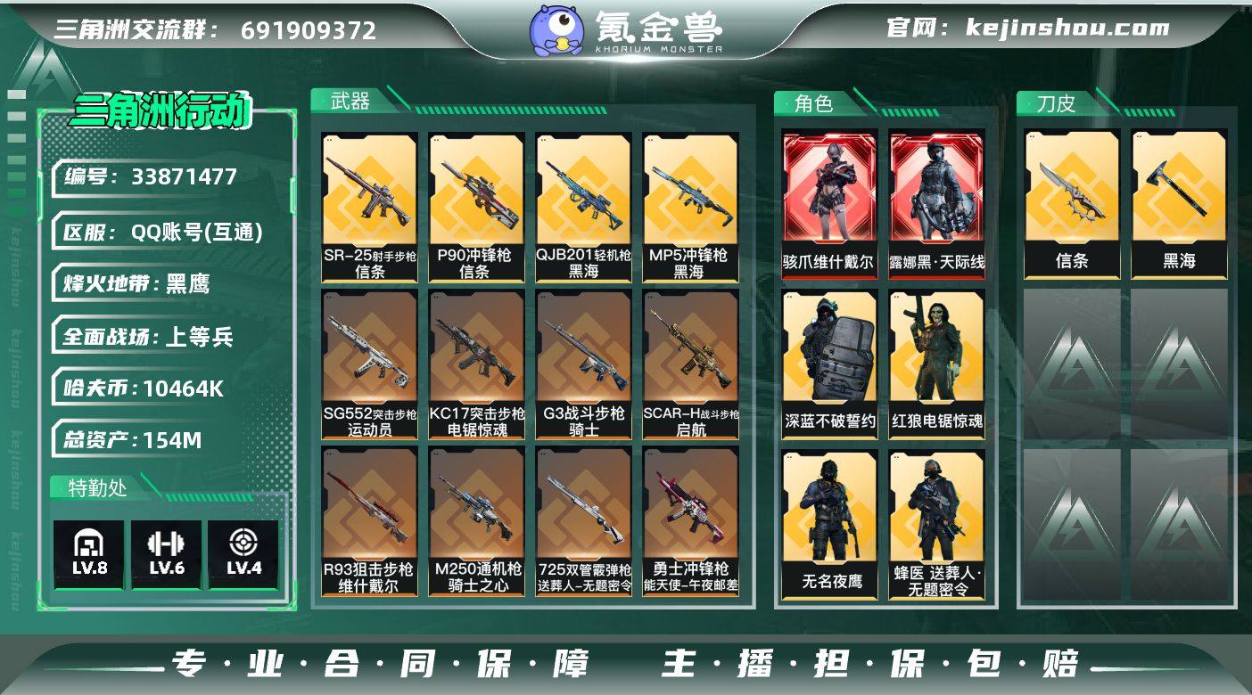 【AYS136】【店主推荐捡漏号!可直接换绑】10464k哈伏币-136m流动资产-60烽火等级-黑鹰-27战场等级-上等兵 【干员外观】:露娜-黑·天际线,骇爪-维什戴尔,蜂医-送葬人·无题密令,无名-夜鹰,深蓝-不破誓约,红狼-电锯惊魂 【近战皮肤】:近战-黑海,近战-信条,近战-黑鹰 【传说外观】:M4A1突击步枪-阿米娅,SG552突击步枪-运动员,AK-12突击步枪-夜鹰,AK-12突击步枪-特斯拉线圈,SCAR-H战斗步枪-启航,G3战斗步枪-骑士,AS Val突击步枪-蛇年祥瑞,腾龙突击步枪-捞点薯条,KC17突击步枪-电锯惊魂,MP5冲锋枪-黑海,P90冲锋枪-信条,UZI冲锋枪-特斯拉线圈,SMG-45冲锋枪-骑士,SR-3M紧凑突击步枪-特斯拉线圈,勇士冲锋枪-能天使-午夜邮差,725双管霰弹枪-送葬人-无题密令,M250通用机枪-骑士之心,QJB201轻机枪-黑海,SR-25射手步枪-水墨云图,SR-25射手步枪-信条,R93狙击步枪-维什戴尔,AWM狙击步枪-捞点薯条,93R-捞点薯条,复合弓-黑·天际线 【史诗外观】:AKM突击步枪-林中猎手,QBZ95-1突击步枪-曙光,ASh-12战斗步枪-守夜人,ASh-12战斗步枪-无极限,M16A4突击步枪-竞赛选手,AUG突击步枪-蝮蛇,M7战斗步枪-禁卫,SG552突击步枪-尖端治疗,SG552突击步枪-深海恐惧,S...