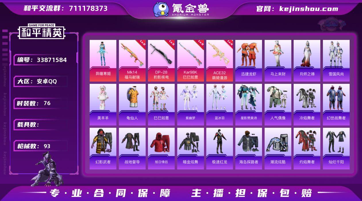 实名: 可修改 时装数: 321 枪械数: 94 战备数: 67 热门装扮: 异瞳寒姬 稀有枪皮:ACE32-萌骑漫游(四级),Kar98K-巳巳如意(五级),Mk14-福马献瑞(五级),DP-28-豹影疾电(五级)