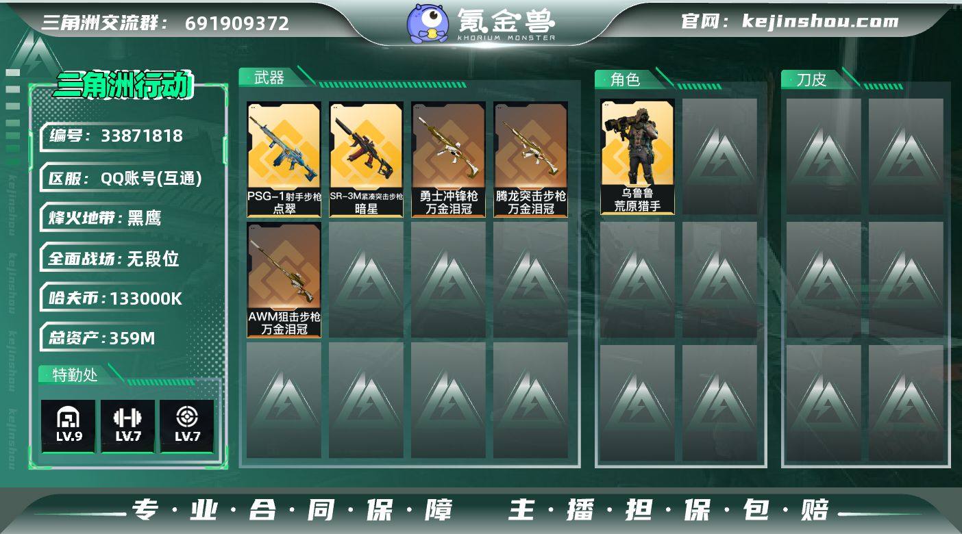A12877/包人脸/QQ区【总资产:358.8M(133M纯币)+73发aw+近战暗星+部门全3+仓库9+体力负重满】/烽火等级:60级/全面战场:17级/纯币:133000K/三角券加币:120(三角币40+三角券80)【近战-暗星】乌鲁鲁-荒原猎手/部门:33333/特勤等级(技术中心3级/工作台3级/制药台3级/防具台3级/仓库9级/指挥中心6级/训练中心7级/靶场7级/潜水中心2级/收藏室1级)SG552突击步枪-点翠/腾龙突击步枪-万金泪冠/SR-3M紧凑突击步枪-暗星/勇士冲锋枪-万金泪冠/PSG-1射手步枪-点翠/AWM狙击步枪-万金泪冠/橙色挂饰x2/段位:黑鹰(流动资产:307.5M)/详细看图