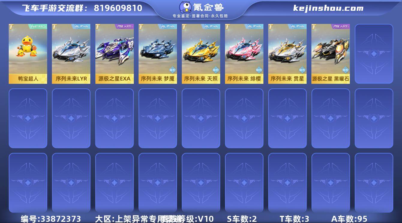 V10 等级91级。3永久T车 95永久A车 174永久赛车 74宠物 男号序列未来有4个皮肤,源纪之星一个皮肤。冰魄,天行者、月影,星皇这些都有皮肤。2套魔法套装、竞速道具、宠物都有。附带王者荣耀英雄基本齐全,很多皮肤。