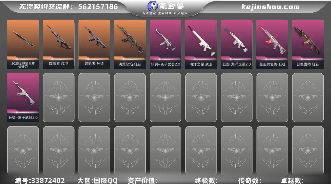 【套装】:2025全球冠军赛套装,噬影者套装,VCT 2025 赛季套装,离子武器//2.0套装 【英雄】:幻棱,炼狱,维斯,暮蝶,壹决,铁臂,捷风,雷兹,幽影,不死鸟,贤者,猎枭,蝰蛇,零,芮娜,奇乐,尚勃勒,夜露,黑梦 【近战武器】:近战武器-2025全球冠军赛 蝴蝶刀,近战武器-蒙太奇 战斧,近战武器-VCT 2025 爪刀,近战武器-黑波之刃,近战武器-噬影者 簇刃,近战武器-离子武器//2.0 爪刀,近战武器-全息匕首,近战武器-诡秘蛇影 军刀,近战武器-神圣领域 战刀,近战武器-星际猎兵 短剑 【狂徒】:狂徒-2025全球冠军赛,狂徒-洪荒怒焰,狂徒-全息波普//2.0,狂徒-创·纪元,狂徒-噬影者,狂徒-盖亚的复仇,狂徒-日冕雄师,狂徒-离子武器//2.0,狂徒-诡秘蛇影 【幻影】:幻影-海洋之星//2.0,幻影-神圣领域,幻影-蒙太奇,幻影-末日之翼 【戍卫】:戍卫-噬影者,戍卫-海洋之星,戍卫-月球哨兵,戍卫-折光棱晶 【獠犬】:獠犬-神圣领域 【冥驹】:冥驹-星云暗涌 【飞将】:飞将-末日之翼 【莽侠】:莽侠-诡秘蛇影,莽侠-月球哨兵 【战神】:战神-离子武器//2.0,战神-神圣领域,战神-蒙太奇 【奥丁】:奥丁-末日之翼 【判官】:判官-诡秘蛇影 【雄鹿】:雄鹿-月球哨兵 【骇灵...