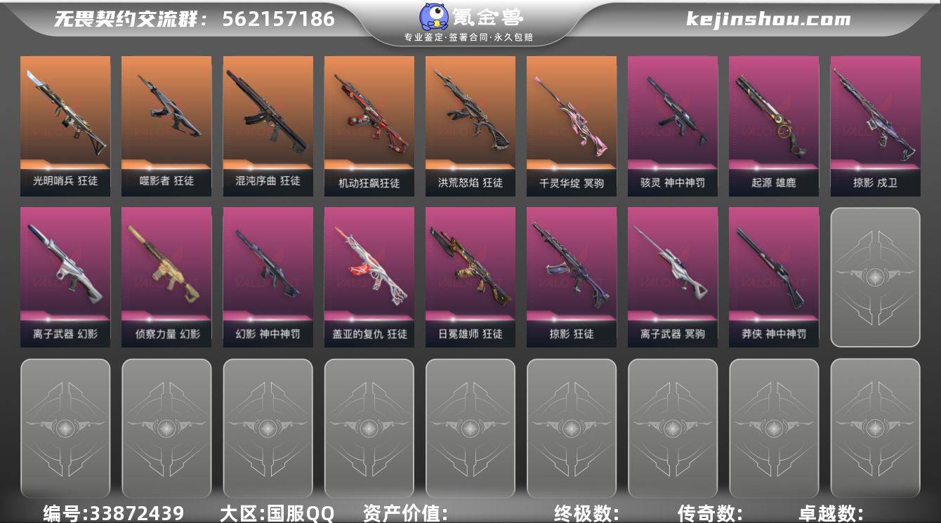 【套装】:VCT 2026 赛季套装,ORA x 颗秒套装,西部未来套装,神中神罚套装 【英雄】:幻棱,炼狱,维斯,暮蝶,钛狐,壹决,铁臂,捷风,雷兹,幽影,不死鸟,贤者,猎枭,零,芮娜,尚勃勒,霓虹,斯凯,夜露,K/O,盖可,黑梦,钢锁 【近战武器】:近战武器-蒙太奇 战斧,近战武器-碎心裂刃,近战武器-VCT 2026 篆刀,近战武器-ORA x 颗秒 军刀,近战武器-神之刃,近战武器-RGX 11z Pro//2.0 蝴蝶刀,近战武器-紫金爪刀,近战武器-RGX 11z Pro//3.0 爪刀,近战武器-未来开拓者,近战武器-诡秘蛇影 军刀,近战武器-神圣领域 战刀,近战武器-日耀风暴 遗器 【狂徒】:狂徒-光明哨兵,狂徒-洪荒怒焰,狂徒-混沌序曲,狂徒-机动狂飙,狂徒-塑水宗,狂徒-噬影者,狂徒-ORA x 颗秒,狂徒-掠影,狂徒-盖亚的复仇,狂徒-日冕雄师,狂徒-诡秘蛇影 【幻影】:幻影-西部未来,幻影-ORA x 颗秒,幻影-离子武器,幻影-侦察力量,幻影-神中神罚,幻影-神圣领域,幻影-蒙太奇,幻影-末日之翼,幻影-西部未来 【戍卫】:戍卫-掠影,戍卫-月球哨兵,戍卫-折光棱晶 【獠犬】:獠犬-神圣领域 【冥驹】:冥驹-千灵华绽,冥驹-ORA x 颗秒,冥驹-离子武器,冥驹-星云暗涌 【飞将】:飞将-西部未...