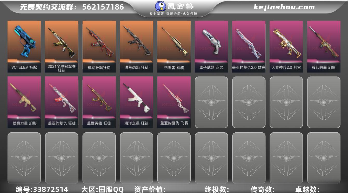 【英雄】:幻棱,炼狱,维斯,暮蝶,钛狐,壹决,铁臂,捷风,雷兹,幽影,不死鸟,贤者,猎枭,蝰蛇,零,芮娜,奇乐,尚勃勒,霓虹,斯凯,夜露,星礈,K/O,海神,盖可,黑梦,钢锁 【近战武器】:近战武器-鬼丸国纲,近战武器-珍珠棘贝 短剑,近战武器-流星兵团 短剑,近战武器-超限闪存 匕首,近战武器-沙尘幻旅 匕首 【狂徒】:狂徒-2021全球冠军赛,狂徒-洪荒怒焰,狂徒-机动狂飙,狂徒-盖世英雄,狂徒-盖亚的复仇,狂徒-海洋之星,狂徒-流星兵团,狂徒-沙尘幻旅 【幻影】:幻影-般若假面,幻影-侦察力量,幻影-超限闪存,幻影-珍珠棘贝 【戍卫】:戍卫-珍珠棘贝,戍卫-浮光跃金,戍卫-萌彩剪影,戍卫-战术熊与伙伴们 【獠犬】:獠犬-复古浪潮,獠犬-胡桃狂想,獠犬-模拟赫兹 【冥驹】:冥驹-归零者,冥驹-复古浪潮,冥驹-胡桃狂想,冥驹-模拟赫兹 【飞将】:飞将-盖亚的复仇,飞将-沙尘幻旅,飞将-战术熊与伙伴们 【莽侠】:莽侠-超限闪存,莽侠-深海水族,莽侠-纤云弄巧 【战神】:战神-浮光跃金,战神-萌彩剪影,战神-深海水族 【奥丁】:奥丁-流星兵团 【判官】:判官-天界神兵//2.0,判官-萌彩剪影 【雄鹿】:雄鹿-盖亚的复仇//2.0,雄鹿-复古浪潮,雄鹿-模拟赫兹...