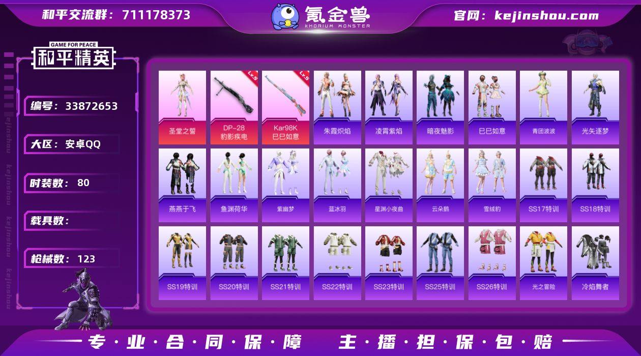 实名: 可修改 时装数: 314 枪械数: 123 战备数: 87 热门装扮: 暗夜魅影,圣堂之誓 稀有枪皮: Kar98K-巳巳如意(五级),DP-28-豹影疾电(五级)