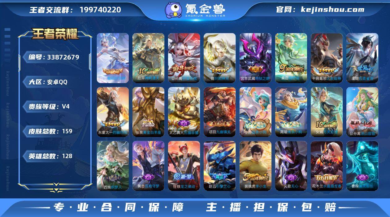安卓Q-V4-永恒钻石II段位-128英雄-159皮肤-1典藏皮肤-9传说-33史诗 【英雄全皮】:敖隐全皮,影全皮 【荣耀典藏】:伽罗最初的交响 【传说皮肤】:后羿神树通天,桑启鸣野蒿,东皇太一灼幽烈阳,公孙离祈雪灵祝,镜炽阳神光,张良黄金白羊座,干将莫邪久胜战神,虞姬云霓雀翎,宫本武藏地狱之眼 【限定皮肤】:姜子牙天穹之誓,狄仁杰阴阳师,赵云皇家上将,赵云引擎之心,元歌无心,项羽海滩派对,貂蝉逐梦之音,百里玄策原初追逐者,公孙离祈雪灵祝,裴擒虎李小龙,裴擒虎擒涛扼浪,鲁班大师探海日志,桑启海盐诗旅,艾琳女武神,张良古海寻踪,鬼谷子天穹祈灯,沈梦溪龙舞盛年,刘邦剑破天穹,程咬金群星魔术团,周瑜熔金海岸 【年限皮肤】:公孙离祈雪灵祝 【赛季限定】:桑启海盐诗旅,裴擒虎擒涛扼浪,鲁班大师探海日志,张良古海寻踪,鬼谷子天穹祈灯,刘邦剑破天穹,姜子牙天穹之誓,东皇太一噬灭天穹,太乙真人谧流熔炉,钟馗虚灵犬护,甄姬逆浪荇歌,亚瑟荣光之誓,百里玄策原初追逐者,牛魔星界战将,项羽九幽镇关 【战令限定】:周瑜线条小狗,小乔线条小狗 【史诗皮肤】:太乙真人瓦猫非猫,周瑜线条小狗,小乔线条小狗,项羽九幽镇关,女娲万灵启世,公孙离涂山...