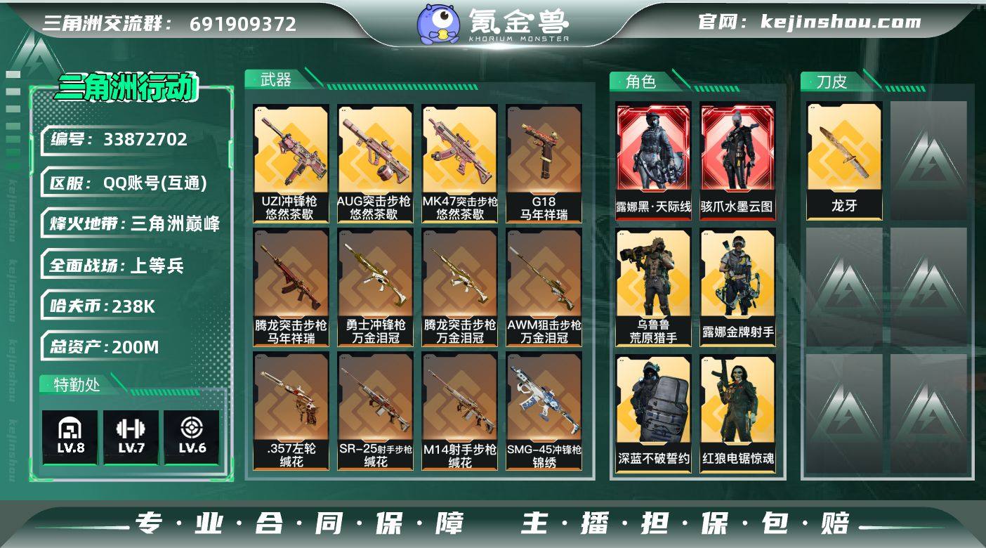 【PTSJZ4383】总资产200M/哈夫币23万/传说近战数1/传说枪皮数32/战场等级35/行动等级60/安全箱等时效性道具以游戏内数据为准,详情请看图/骇爪-水墨云图/露娜-黑·天际线/蜂医-送葬人·无题密令(S5)/深蓝-不破誓约(S6)/红狼-电锯惊魂/露娜-金牌射手(S7)/乌鲁鲁-荒原猎手/近战-龙牙/近战-处刑者4级/近战-黑鹰/M4A1突击步枪-阿米娅/AKM突击步枪-锦绣/AUG突击步枪-悠然茶歇/SG552突击步枪-运动员/AK-12突击步枪-特斯拉线圈/SCAR-H战斗步枪-水墨云图/SCAR-H战斗步枪-启航/G3战斗步枪-骑士/CAR-15突击步枪-阿米娅/腾龙突击步枪-捞点薯条/腾龙突击步枪-马年祥瑞/腾龙突击步枪-万金泪冠/K437突击步枪-锦绣/KC17突击步枪-电锯惊魂/MK47突击步枪-悠然茶歇/UZI冲锋枪-特斯拉线圈/UZI冲锋枪-悠然茶歇/SMG-45冲锋枪-锦绣/SR-3M紧凑突击步枪-特斯拉线圈/勇士冲锋枪-能天使-午夜邮差/勇士冲锋枪-万金泪冠/725双管霰弹枪-送葬人-无题密令/M250通用机枪-骑士之心/M14射手步枪-蛮荒/M14射手步枪-缄花/SR-25射手步枪-缄花/AWM狙击步枪-捞点薯条/AWM狙击步枪-万金泪冠/.357左轮-缄花/G18-马年祥瑞/93R-捞点薯条/复合弓-黑-天际线/QBZ95-1突击步枪-曙光/ASh-12战斗步枪-无极限/K416突击步枪-冬日风情...