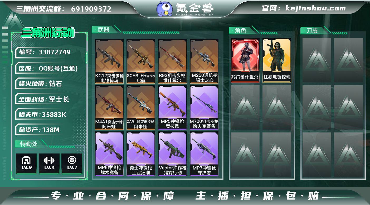 【AYS209】 【店主推荐捡漏号!可直接换绑】35883k哈伏币-107m流动资产-60烽火等级-钻石-20战场等级-军士长 资产138m【干员外观】:骇爪-维什戴尔,红狼-电锯惊魂 【近战皮肤】:近战-黑鹰 【传说外观】:M4A1突击步枪-阿米娅,SCAR-H战斗步枪-启航,CAR-15突击步枪-阿米娅,KC17突击步枪-电锯惊魂,M250通用机枪-骑士之心,R93狙击步枪-维什戴尔 【史诗外观】:ASh-12战斗步枪-无极限,K437突击步枪-守护者,MP5冲锋枪-战术竞备,MP5冲锋枪-竞技风,Vector冲锋枪-猎鳄行动,勇士冲锋枪-深海恐惧,勇士冲锋枪-工业狂潮,MP7冲锋枪-守护者,Mini-14射手步枪-守护者,SVD狙击步枪-阿萨拉工艺,M700狙击步枪-哈夫克警备,AWM狙击步枪-无极限,复合弓-守护者 【稀有外观】:AKM突击步枪-战术演练,AKM突击步枪-肃杀,QBZ95-1突击步枪-公平竞技,M7战斗步枪-捣蛋鬼,SCAR-H战斗步枪-荣耀列队,SCAR-H战斗步枪-黄昏,G3战斗步枪-战术演练,G3战斗步枪-主宰,腾龙突击步枪-冰天雪地,MP5冲锋枪-哈夫克卫队,P90冲锋枪-黄昏,P90冲锋枪-捣蛋鬼,Vector冲锋枪-先锋,UZI冲锋枪-亚特兰蒂斯,SMG-45-行动开启,SMG-45冲锋枪-幻影结构,M1014霰弹枪-幻影结构,S12K霰弹枪-战术演练,QJB201...