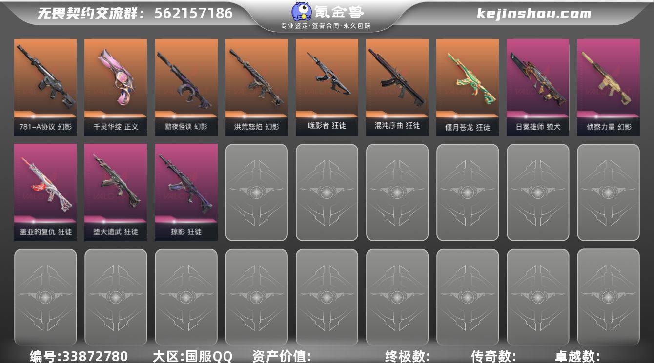 【英雄】:炼狱,维斯,暮蝶,壹决,铁臂,捷风,幽影,不死鸟,贤者,猎枭,芮娜,奇乐,尚勃勒,霓虹,夜露,K/O,盖可,黑梦,钢锁 【近战武器】:近战武器-嘟昂嘟昂超弹力水球拳套,近战武器-5周年//公测重制版 苍龙之刃,近战武器-奇点//2.0 蝴蝶刀,近战武器-未来开拓者,近战武器-影刃,近战武器-阿特拉斯指挥部 甩棍,近战武器-星际猎兵 短剑 【狂徒】:狂徒-混沌序曲,狂徒-塑水宗,狂徒-偃月苍龙,狂徒-噬影者,狂徒-RGX 11z Pro,狂徒-超时空卫队,狂徒-堕天遗武,狂徒-掠影,狂徒-盖亚的复仇 【幻影】:幻影-黯夜怪谈,幻影-洪荒怒焰,幻影-781-A协议,幻影-侦察力量,幻影-异鳞魔蛇 【獠犬】:獠犬-日冕雄师 【正义】:正义-千灵华绽 【卡面】:Clutch 卡面,无畏契约GO!第一卷:芮娜 卡面,无畏契约GO!第一卷:零 卡面,《双城之战》金克丝 卡面,钢锁vs盖可 卡面,代号红色 卡面,新兵报到 卡面,V契约 卡面,无畏契约 卡面 【喷漆】:买装还是存钱 喷漆,胜利属于无畏契约 喷漆,GLHF 喷漆,无畏契约 喷漆 【挂饰】:天外飞客 挂饰,《双城之战》魄罗 挂饰,无畏契约 纪念币 挂饰