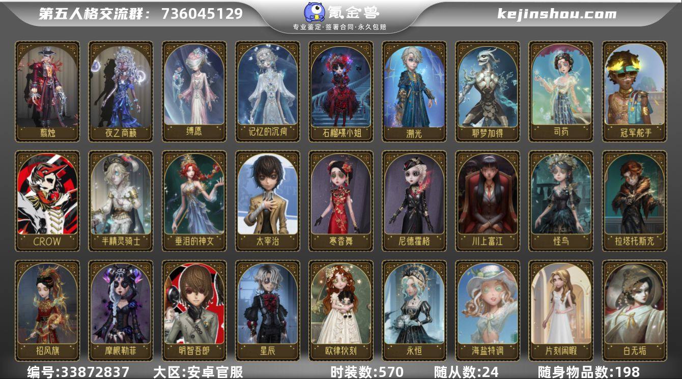 账号类型: 手机账号 时装数: 570 时装: 爱哭鬼-被时间遗忘的男孩,病患-星辰,大副-明智吾郎,大副-CROW,大副-罗勒,红蝶-白无垢,红蝶-仙鹤,红蝶-彼岸,红蝶-竹华,黄衣之主-异星,红夫人-最后一舞,“杰克”-绿纹大触,“杰克”-金纹大触,祭司-摩根勒菲,祭司-“厄运”,祭司-冰中蝶,空军-尼德霍格,空军-寒香舞,昆虫学者-曼陀罗,律师-兰斯洛特,鹿头-蒸汽朋克,魔术师-文学教授,魔术师-广津柳浪,冒险家-警醒的龟先生,冒险家-考古教授,盲女-吉尔达,梦之女巫-川上富江,牛仔-逆刃之鞭,前锋-坂本龙司,“囚徒”-太宰治,入殓师-喜多川祐介,摄影师-月下绅士,守墓人-列车长,守墓人-奶酪,调酒师-海盐特调,玩具商-线控信号,玩具商-纸翼小姐,幸运儿-拉塔托斯克,先知-观测者,园丁-兰闺惊梦,园丁-怪鸟,佣兵-弹簧手,佣兵-思明,邮差-琴键,渔女-迷迭香,蜘蛛-花祭,咒术师-缄默者,杂技演员-雨宫莲,杂技演员-可可豆,杂技演员-气胎,记者-永恒,空军-爱神之吻,守墓人-半精灵骑士,“小女孩”-欧律狄刻,心理学家-长夜,画家-温暖的平安夜,古董商-招风旗,渔女-垂泪的神女,勘探员-盖提亚之遗,爱丽丝·德罗斯-片刻闲暇,“囚徒”-毕业日,隐士-游隼,牛仔-船影,先知-纯白之盐,调酒师-逐浪的玫瑰,玩具商-清洁翼,幸运儿-蛋小黄的好朋友,古...
