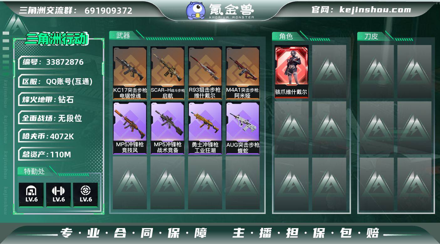 【AYS219】【店主推荐捡漏号!可直接换绑】 110m总资产-4072k哈伏币-58烽火等级-钻石-1战场等级-无军衔 【干员外观】:骇爪-维什戴尔 【近战皮肤】:近战-黑鹰 【传说外观】:M4A1突击步枪-阿米娅,SCAR-H战斗步枪-启航,KC17突击步枪-电锯惊魂,R93狙击步枪-维什戴尔 【史诗外观】:AUG突击步枪-蝮蛇,MP5冲锋枪-战术竞备,MP5冲锋枪-竞技风,勇士冲锋枪-工业狂潮 【稀有外观】:AKM突击步枪-肃杀,QBZ95-1突击步枪-公平竞技,M7战斗步枪-捣蛋鬼,K437突击步枪-生存指令,MK47突击步枪-精英联盟,MP5冲锋枪-哈夫克卫队,P90冲锋枪-捣蛋鬼,UZI冲锋枪-亚特兰蒂斯,SMG-45-行动开启,勇士冲锋枪-冰天雪地,QJB201轻机枪-哈夫克卫队,SKS射手步枪-弄臣,SR-25射手步枪-开拓 【普通外观】:M4A1突击步枪-粉色涂装,M4A1突击步枪-海色,QBZ95-1突击步枪-海浪,QBZ95-1突击步枪-三角洲力量,QBZ95-1突击步枪-海色,M16A4突击步枪-高雅黑,AUG突击步枪-浅蓝涂装,SCAR-H战斗步枪-数码迷彩,PTR-32突击步枪-黄蜂,MP5冲锋枪-黄蜂,Vector冲锋枪-几何迷彩,UZI冲锋枪-海色,野牛冲锋枪-高雅黑,M250通用机枪-条纹,SVD狙击步枪-高雅黑,SV-98狙击步枪-红色涂装,沙漠之鹰-高雅黑 【载...