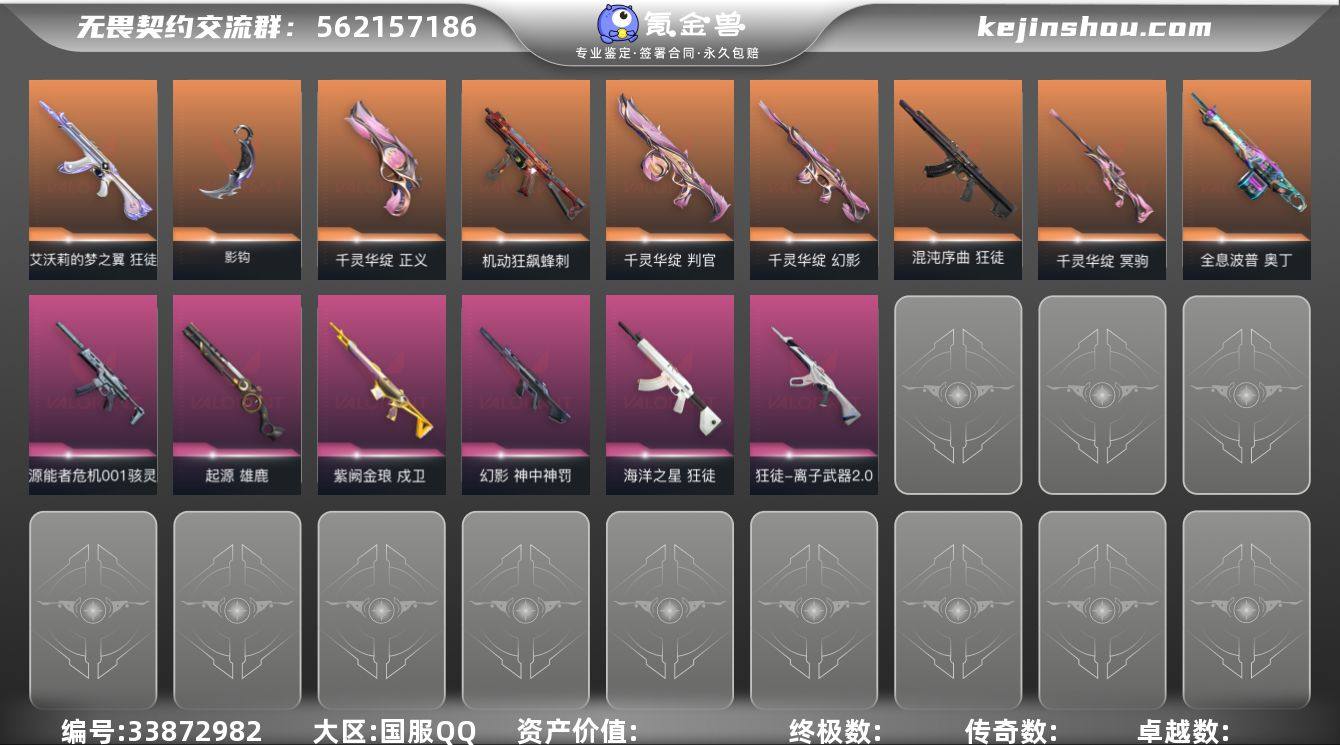 【套装】:2022全球冠军赛套装,千灵华绽套装,般若假面//2.0套装 【英雄】:幻棱,炼狱,维斯,暮蝶,钛狐,壹决,铁臂,捷风,雷兹,幽影,不死鸟,贤者,猎枭,蝰蛇,零,芮娜,奇乐,尚勃勒,霓虹,斯凯,夜露,星礈,K/O,海神,盖可,黑梦,钢锁 【近战武器】:近战武器-2022全球冠军赛 蝴蝶刀,近战武器-嘟昂嘟昂超弹力水球拳套,近战武器-影钩,近战武器-落英飞旋,近战武器-鬼丸国纲,近战武器-流星兵团 短剑,近战武器-诡秘蛇影 军刀,近战武器-阿特拉斯指挥部 甩棍 【狂徒】:狂徒-混沌序曲,狂徒-艾沃莉的梦之翼,狂徒-超时空卫队,狂徒-般若假面//2.0,狂徒-海洋之星,狂徒-离子武器//2.0,狂徒-流星兵团,狂徒-诡秘蛇影 【幻影】:幻影-2022全球冠军赛,幻影-千灵华绽,幻影-神中神罚,幻影-神圣领域,幻影-末日之翼 【戍卫】:戍卫-紫阙金琅,戍卫-战术熊与伙伴们,戍卫-月球哨兵,戍卫-折光棱晶 【獠犬】:獠犬-般若假面//2.0,獠犬-神圣领域 【冥驹】:冥驹-千灵华绽 【飞将】:飞将-战术熊与伙伴们,飞将-末日之翼 【莽侠】:莽侠-诡秘蛇影,莽侠-纤云弄巧,莽侠-月球哨兵 【战神】:战神-般若假面//2.0,战神-神圣领域 【奥丁】:奥丁-全息波普,奥丁-流星...