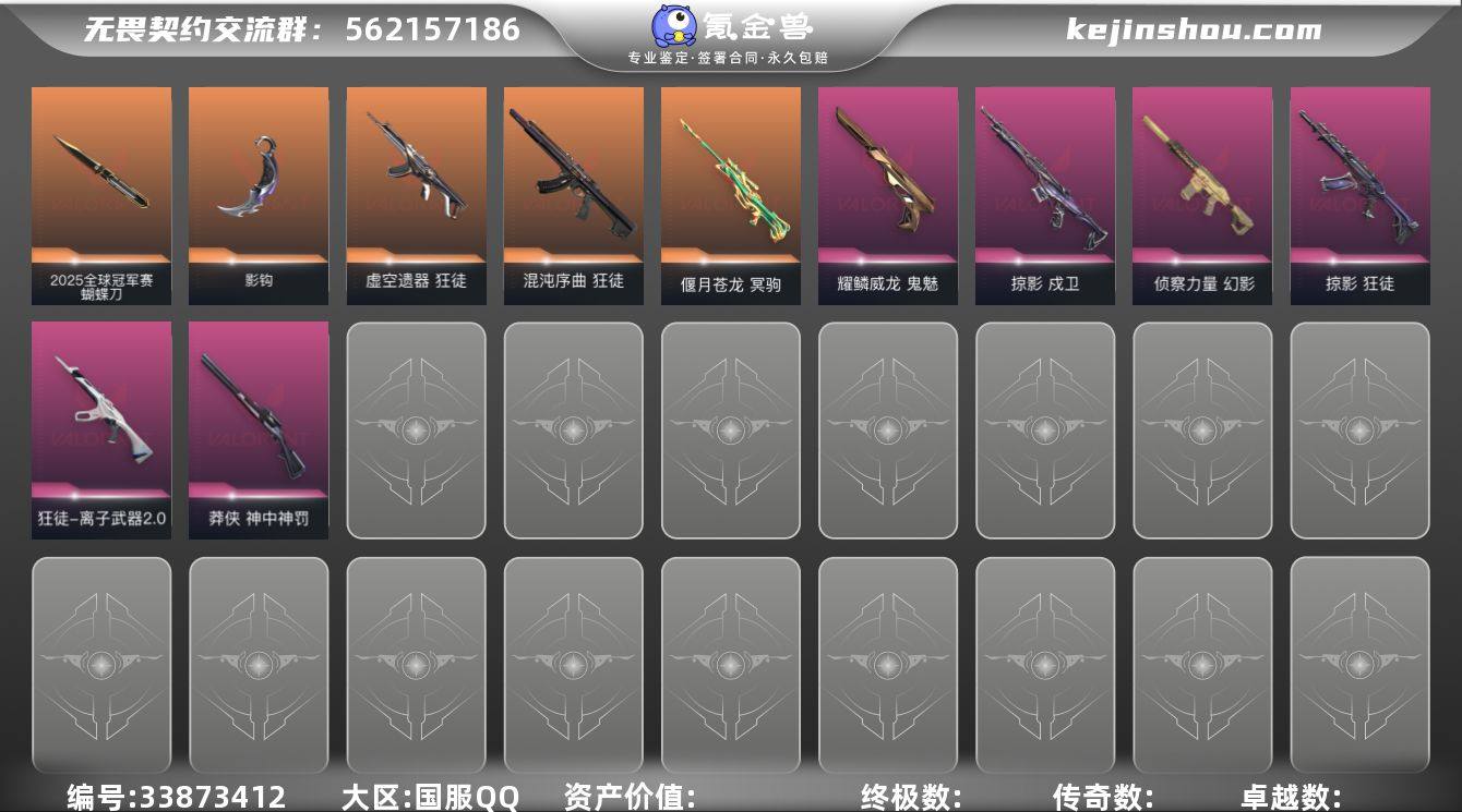 【套装】:2025全球冠军赛套装,VCT 2026 赛季套装,无畏契约季前邀请赛套装,回火礼包:掠影套装,掠影//3.0套装 【英雄】:幻棱,炼狱,维斯,暮蝶,钛狐,壹决,铁臂,捷风,雷兹,幽影,不死鸟,贤者,猎枭,蝰蛇,零,芮娜,奇乐,尚勃勒,霓虹,斯凯,夜露,星礈,K/O,海神,盖可,黑梦,钢锁 【近战武器】:近战武器-2025全球冠军赛 蝴蝶刀,近战武器-蒙太奇 战斧,近战武器-碎心裂刃,近战武器-VCT 2026 篆刀,近战武器-影蝶,近战武器-无畏契约季前邀请赛 悲悯之刃,近战武器-影钩,近战武器-机动狂飙 战刀,近战武器-夜刃诡镰,近战武器-诡秘蛇影 军刀,近战武器-日耀风暴 遗器,近战武器-星际猎兵 短剑 【狂徒】:狂徒-2025全球冠军赛,狂徒-混沌序曲,狂徒-塑水宗,狂徒-虚空遗器,狂徒-RGX 11z Pro,狂徒-千灵华绽//2.0,狂徒-超时空卫队,狂徒-掠影,狂徒-离子武器//2.0,狂徒-诡秘蛇影 【幻影】:幻影-侦察力量,幻影-掠影//2.0,幻影-蒙太奇,幻影-末日之翼 【戍卫】:戍卫-掠影,戍卫-折光棱晶 【冥驹】:冥驹-偃月苍龙 【飞将】:飞将-末日之翼 【莽侠】:莽侠-神中神罚,莽侠-诡秘蛇影 【战神】:战神-蒙太奇 【奥丁】:奥丁-掠影//2.0,奥丁-末日之翼 【...
