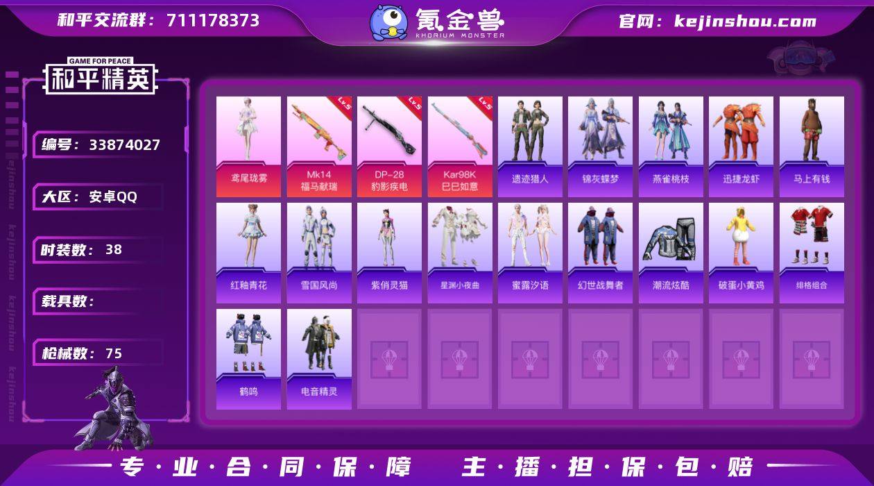 【FK6962】38套装/枪械3/装备73/战备45/王牌印记2/热力值18961/五级Kar98K-巳巳如意/五级MK14-福马献瑞/五级DP-28-豹影疾电/鸢尾珑雾/Kar98K-巳巳如意/MK14-福马献瑞/DP-28-豹影疾电/炫彩糖果飞行器/极意拳锋飞行器/洛神天依降落伞/星穹咏叹调降落伞/炫彩糖果降落伞/鸢尾珑雾降落伞/雪国风尚/炫彩糖果/马上有钱/迅捷龙虾/遗迹猎人/星渊小夜曲/蜜露汐语/紫俏灵猫/雨过天青/红釉青花/锦灰蝶梦/燕雀桃枝/AUG-冰晶雪宝/SCAR-L-炫彩节奏/M416-蓝色火焰/M762-彩虹符号/Mk47-洛神天依/AC-VAL-天降萌叽/UZI-天降萌叽/UZI-炫彩节奏/UMP45-生命誓言/UMP45-极意拳锋/汤姆逊-绒绒猫尾/汤姆逊-像素花束/AKS-74U-星纱魔法/MP7-G-锦灰蝶梦/SKS-糯团青竹/M417-锦灰蝶梦/SVD-冷漠罗丽/S1897-锦灰蝶梦/DBS-彩虹符号/MG3-幻世战舞者/M338-锦灰蝶梦/爆炸猎弓-喜羊羊与灰太狼/平底锅-锦灰蝶梦/幻世战舞者/潮流炫酷/破蛋小黄鸡/绯格组合/鹤鸣/电音精灵
