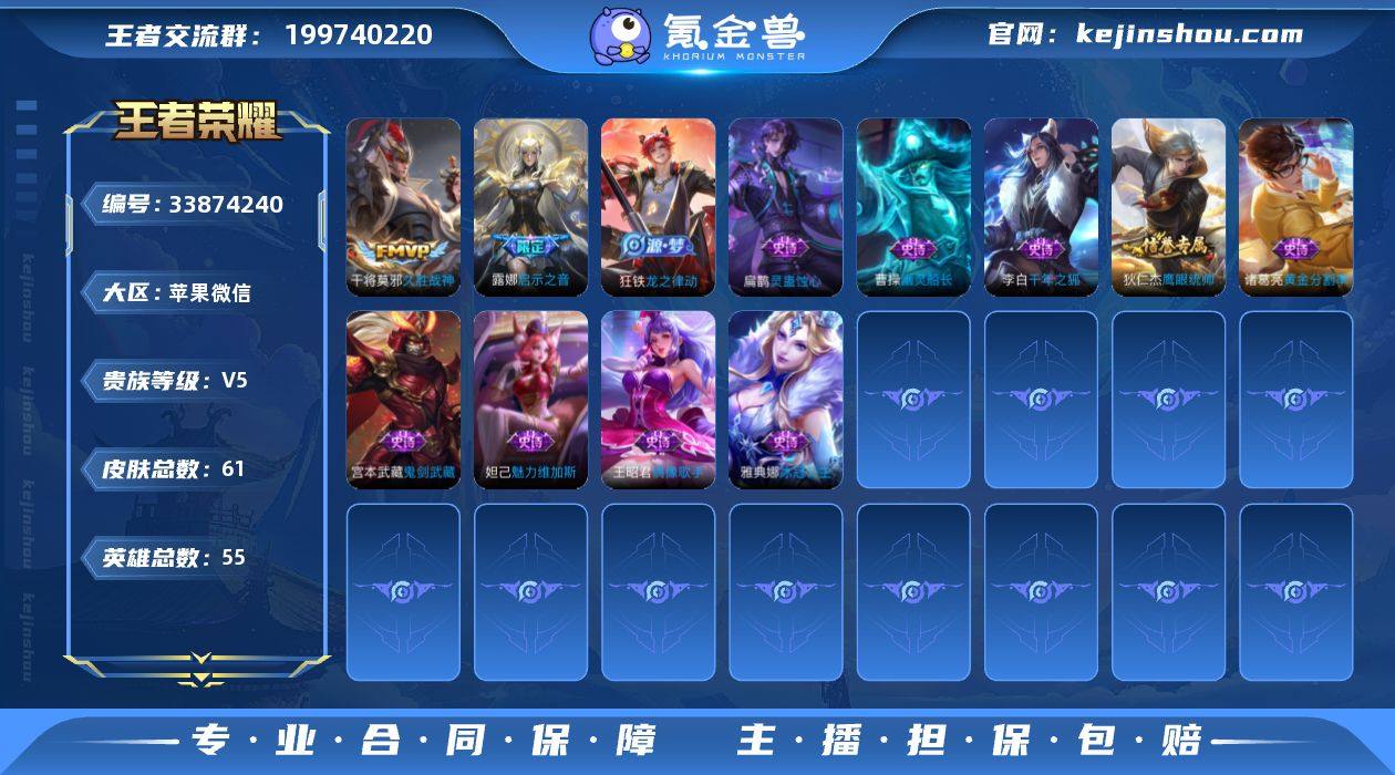 55英雄 61皮肤 可二次 可修改实名 男号 【英雄全皮】蚩奼全皮 【稀有英雄】韩信(韩跳跳),橘右京(橘子),赵云 【无双皮】无相 【传说皮】神骥·逐星野,踏浪归,久胜战神 【赛季/战令皮】剑破天穹(s35),金庭之子(s27),大漠名商(s28),云中旅人(s29) 【史诗皮】海之女神,线条小狗-周瑜,灵蛊蚀心,龙之律动,黄金分割率,千年之狐,冰冠公主,偶像歌手,幽灵船长,鬼剑武藏,鹰眼统帅,魅力维加斯 【限定皮】启示之音 【普通皮】街头霸王,虚灵犬护,鹤鸣心笺,逐霄之志,极光幻客,溯影追猎,班班快跑,荣光之誓,春野闲踪,灵野札记,威尼斯狂欢,海滩派对,皇家上将,掌控之力,敏锐之力,黄金武士,天使之翼,红桃皇后,阴阳师,兔女郎,死亡骑士,忍·炎影,未来纪元-宫本武藏,玩偶对对碰,阿尔法小队,孤猎,灼热之刃,幸存者,荷鲁斯之眼,剑舞者,花见巫女,龙域领主,福禄兄弟,万圣前夜,激情绿茵,精灵王,街头旋风,西部大镖客-孙悟空,碧珀绯影,唤灵魔甲