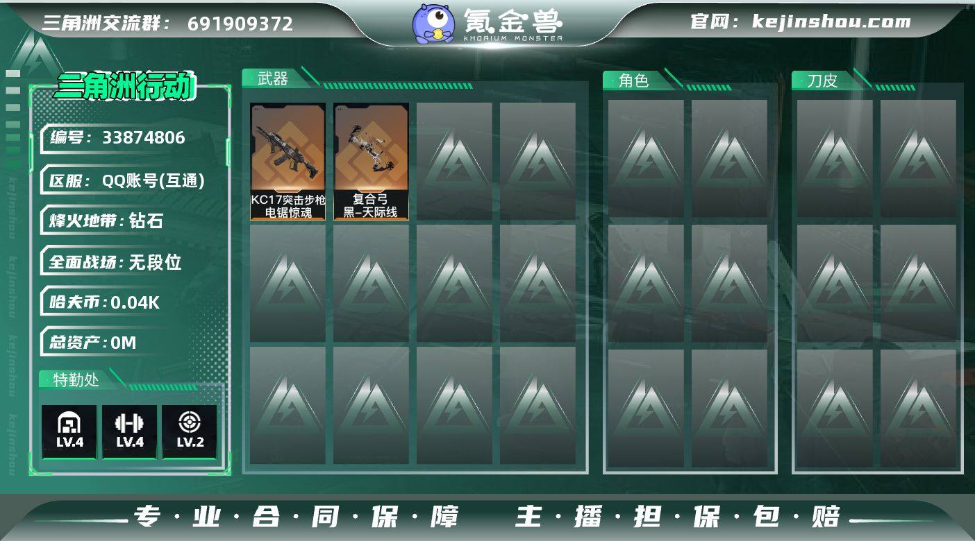 实名: 不可修改 烽火地带段位: 钻石 全面战场段位: 无段位 总资产: 55 哈夫币: 41 传说武器皮肤: 复合弓-黑-天际线,KC17突击步枪-电锯惊魂