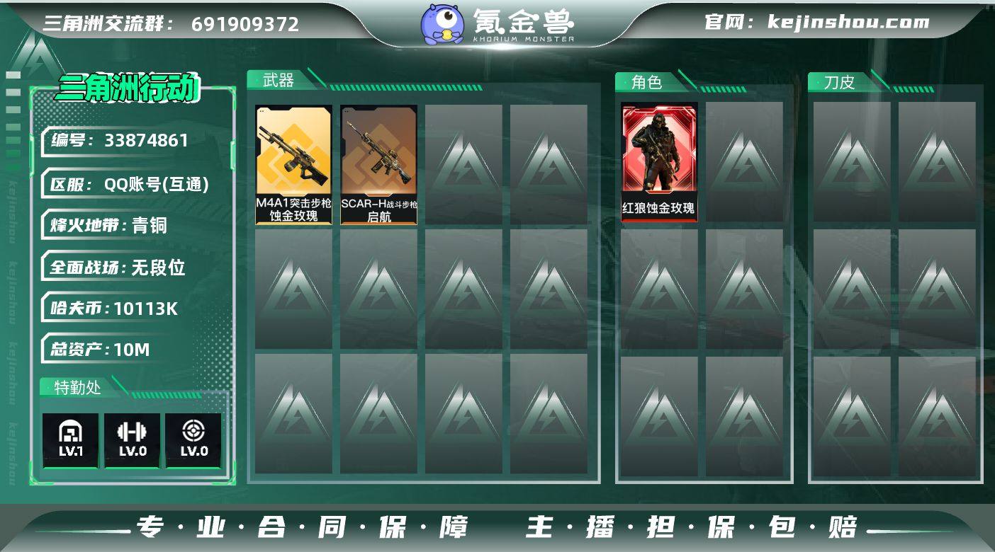 【sjs3645】10m总资产-10113k哈伏币-12烽火等级-青铜-1战场等级-无军衔 【干员外观】:红狼-蚀金玫瑰 【传说外观】:M4A1突击步枪-蚀金玫瑰,SCAR-H战斗步枪-启航 【挂饰】:挂饰-蚀金玫瑰,挂饰-启程