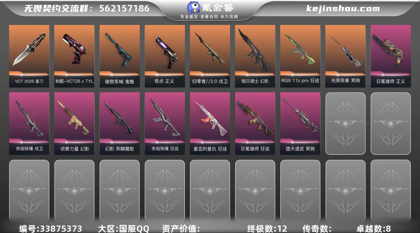 【NF459】【套装】:VCT 2026 赛季套装【英雄】:炼狱,维斯,暮蝶,壹决,铁臂,捷风,雷兹,幽影,不死鸟,贤者,猎枭,蝰蛇,零,芮娜,奇乐,尚勃勒,霓虹,斯凯,夜露,星礈,K/O,盖可【近战武器】:近战武器-荆刺链刃,近战武器-VCT 2026 篆刀【狂徒】:狂徒-RGX 11z Pro,狂徒-荆刺圣骸,狂徒-盖亚的复仇,狂徒-日冕雄师,狂徒-赤焰铁骥【幻影】:幻影-毁灭骑士,幻影-侦察力量,幻影-异鳞魔蛇【戍卫】:戍卫-归零者//2.0,戍卫-赤焰铁骥【冥驹】:冥驹-光荣异象,冥驹-堕天遗武【VCT手枪】:标配-VCT26 x TYL【正义】:正义-奇点,正义-日冕雄师【鬼魅】:鬼魅-破败军械【卡面】:热舞环节 卡面,无畏契约GO!第一卷:芮娜 卡面,无畏契约GO!第一卷:零 卡面,《双城之战》金克丝 卡面,钢锁vs盖可 卡面,代号红色 卡面,新兵报到 卡面,V契约 卡面,无畏契约 卡面【喷漆】:霓光四射 喷漆,买装还是存钱 喷漆,关门放狗 喷漆,无畏契约GO!第一卷:贤者 喷漆,暴走萝莉 喷漆,无畏契约GO!第一卷:奇乐 喷漆,胜利属于无畏契约 喷漆,GLHF 喷漆,无畏契约 喷漆【挂饰】:无畏契约GO!第一卷 零 挂饰,Z世代特饮 挂饰,天外飞客 挂饰,《双城之战》魄罗 挂饰,无畏...