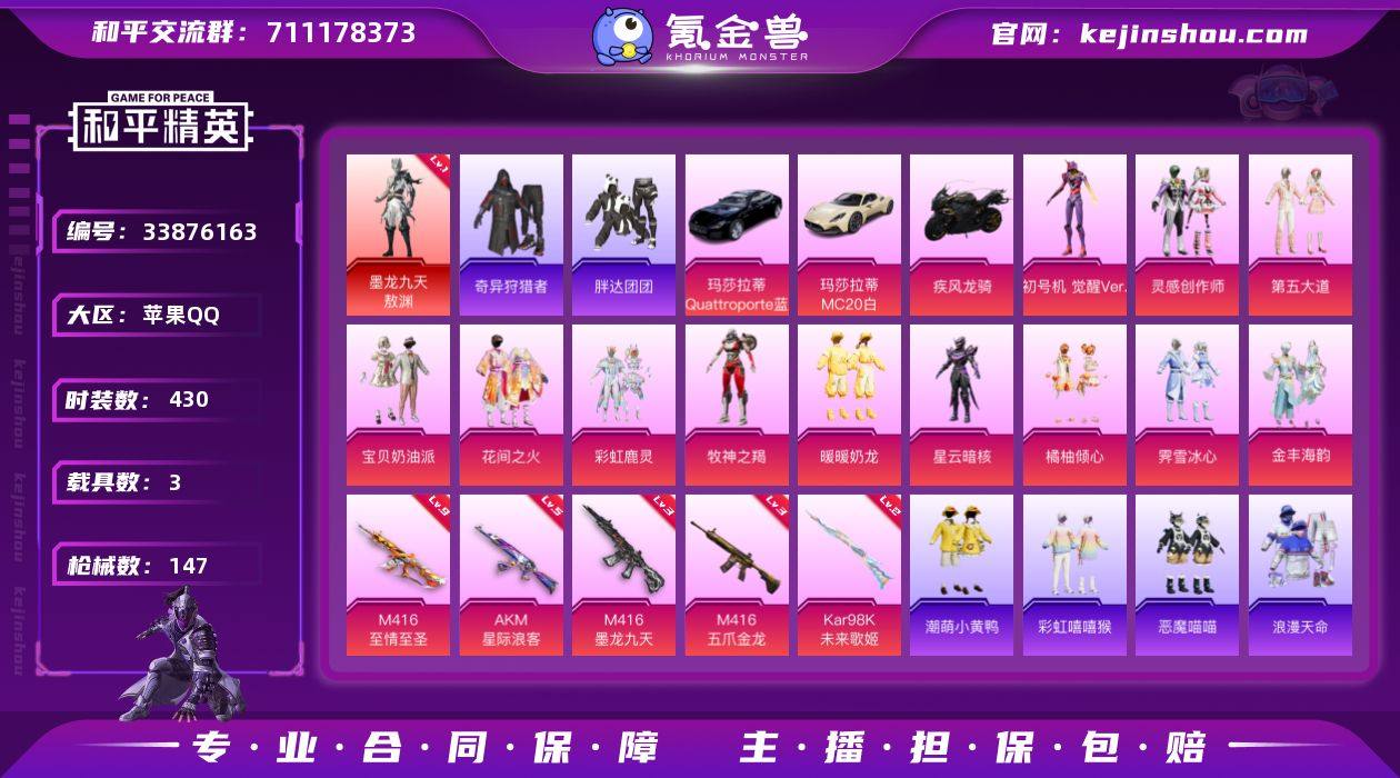 【特价出售】苹果Q-1红装3稀有3载具12粉装5特效枪12热门117套装147枪皮 55248热力值 9印记 历史卓越王牌11星 【1红装】 墨龙九天-敖渊 (1级) 【3稀有】 奇异狩猎者 AKM-缤纷海域 浪漫天命 【3载具】 玛莎拉蒂M白色 玛莎拉蒂Q蓝色 疾风龙骑 【12粉装】 觉醒初号机 暖暖奶龙 宝贝奶油派 金丰海韵 星云暗核 牧神之羯 橘柚倾心 第五大道 花间之火 灵感创作师 霁雪冰心 彩虹鹿灵 【5特效枪】 M416-五爪金龙 (3级) M416-墨龙九天 (3级) AKM-星际浪客 (5级) M416-至情至圣 (9级) Kar98K-未来歌姬 (2级) 【12热门】 Mark.06 潮萌小黄鸭 六号树人 恶魔喵喵 胖达团团 粉红小猪 漫步者 破蛋小黄鸡 AKM-奇异狩猎者 M24-奇异狩猎者 MK47-林间仙鹿 Mini14-林间仙鹿 【3飞行器】 龙翔九天飞行器 千面幻镜飞行器 天之羽翼飞行器 【1头盔】 国宝胖达头盔 【2背包】 甜心宝贝背包 萌熊伴侣背包