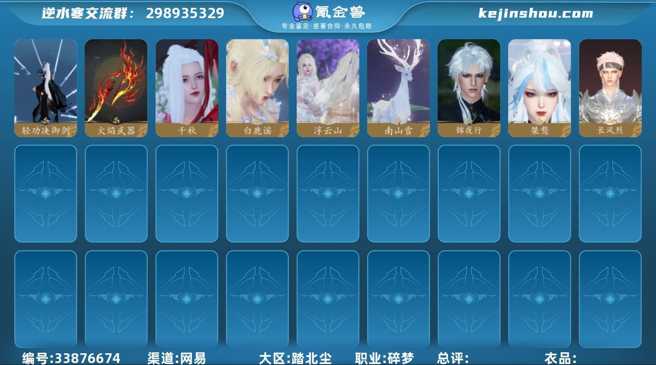 【已用天赏石10-转盘1-未用天赏1】战力值:275178 总评:275178 角色等级:89 衣品值: 135105 国色值: 17140 已用天赏石:10 未用天赏石:1 【网易邮箱账号】 【无换绑冷却】 【碎梦】 【男】 【4级】 【把酒临风】 【互通】 转盘外观1 天赏外观7 天赏祥瑞1 武器环身2 转盘外观:长风烈; 天赏外观:桀骜,浮云山,白鹿谣,千秋,锦夜行,火焰武器,轻功诀御剑; 天赏祥瑞:南山雪; 武器环身:天下不服,银甲霜锋;