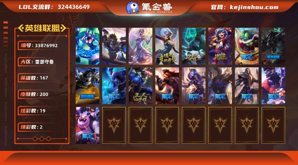 【LOLYH2396】167英雄/200皮肤/3终极/4神话/16限定/2臻彩/19炫彩/28传说/60史诗/白银/雪花/10周年 安妮/源代码 乐芙兰/10周年庆典 凤凰/黎明使者 卡尔玛/冠军典狱长 锤石 凯旋圣装/魔女 阿卡丽 虚荣/圣诞狂欢 努努/冰雪节 茂凯/圣诞老人 酒桶/大元素使/DJ-娑娜/未来战士/冠军典狱长 锤石/S2 暗杀星 蒙多/S2 暗杀星 努努/胜利女神 希维尔/胜利女神 奥莉安娜/胜利之剑 亚托克斯/胜利枪神 卢锡安/胜利女神-菲奥娜/蓝色忧郁 崔斯特/外星装甲 库奇/暗影 沃里克/防暴天使 凯尔/铁哥们儿 奥拉夫/魔幻卡牌 崔斯特/战地机甲 厄加特/邪鸦魅影 乐芙兰/霸天零式 赛恩/约德尔国队长 提莫/源计划:联合 艾希/战地巨兽 科加斯/黯晶凤凰 艾尼维亚/女主播 迦娜/未来战士 凯特琳/陆地王者4WD 布里茨/苹果机器人 布里茨/冰川巨兽 墨菲特/上古战魂 魔腾/地狱行者 孙悟空/丧尸 布兰德/源计划:净化 薇恩/银河魔装机神 兰博/第三类接触 黑默丁格/钢铁军团 盖伦/黯黑魔龙 希瓦娜/偶像歌手 阿狸/霸天异形 卡兹克/神王 德莱厄斯/黑夜使者 亚索/西部魔影 卢锡安/暗星 锤石/腥红之月 崔斯特/屠龙勇士 赵信/铁钩船长 费德提克/铁血剑豪 易/地狱火 阿利斯塔/战场公主 希维尔/钢铁之心 希维尔/火箭达人 崔丝...