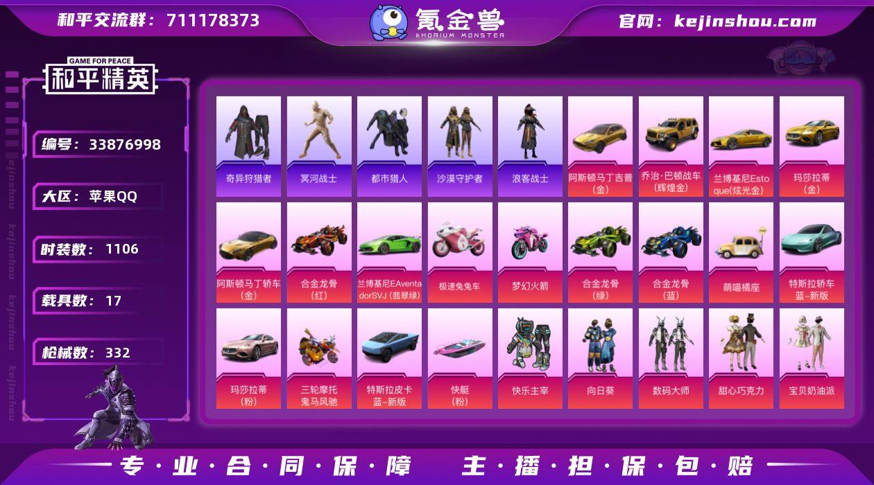 实名: 可修改 时装数: 1106 载具数: 17 枪械数: 332 战备数: 17 热门装扮: 奇异狩猎者,梦幻火箭(新101),蝶舞迷情,古堡领主,甜心巧克力,数码大师,守护骑士,快乐主宰,星之信仰,宝贝奶油派,浪漫波比,天使彩虹糖,梦魇先生,鹰眼刺客,缤纷油彩,王子的夏天,向日葵,好奇恐龙,甜蜜誓约,都市猎人,东方飞龙,怪兽之王,彗云及圣,绚金战神,花间之火,银刃赛罗,扶摇飞仙,精灵迷巫,俏皮狐尾,山涧鹿灵,烈焰拳霸,炙焰赤龙,虎啸骄阳,迪迦闪耀型,赛罗闪耀型,冥河战士,彩虹鹿灵,齐天大圣,洛天依,初号机款机体服,沙漠守护者,潮萌小黄鸭,大橘为重,浪客战士,奇迹天团,蔷薇魔法师,软萌银虎,神秘黑猫 载具: 玛莎拉蒂Ghibli(金),玛莎拉蒂Ghibli(粉),双人摩托-梦幻火箭,阿斯顿·马丁DBS(金),阿斯顿·马丁DBX(金),合金龙骨(蓝),合金龙骨(绿),合金龙骨(红),特斯拉Roadster(水滴蓝),特斯拉Cybertruck(荒芜蓝),快艇-塞莎KL27(霓虹粉),鬼马风驰,萌喵橘座,兰博基尼Estoque(炫光金),兰博基尼Aventador SVJ(翡翠绿),极速兔兔车,僚机-萌兔起飞,乔治·巴顿战车(辉煌金) 稀有枪皮: MG3洛神天依,Mini14龙虾霸霸,黄金龙骨Mini14,M762甜蜜誓约,M24星之信仰,AKM炫紫旋律,Kar98K伏魔团,M416五爪金龙,SCAR-L梦幻火箭,AKM甜...