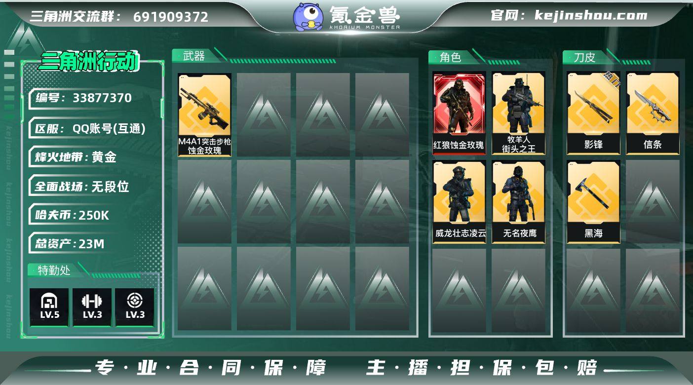 A13096/可二次/QQ区【总资产:23.1M+近战黑海+近战影锋+近战信条+红狼蚀金玫瑰+威龙壮志凌云+13发AW子弹】/烽火等级:60级/全面战场:5级/纯币:250K/三角券加币:610(三角币610)【近战-黑海/近战-影锋/近战-信条】【红狼-蚀金玫瑰】【威龙-壮志凌云/无名-夜鹰/牧羊人-街头之王】/部门:12111/特勤等级(技术中心3级/工作台3级/制药台3级/防具台3级/仓库5级/指挥中心3级/训练中心6级/靶场4级)(流动资产:14M)M4A1突击步枪-蚀金玫瑰/P90冲锋枪-信条/AK-12突击步枪-夜鹰/SR-25射手步枪-水墨云图/AWM狙击步枪-影锋/橙色挂饰x14/段位:黄金IV/详细看图 登不上qq ,近战-黑海,近战-影锋,近战-信条,红狼-蚀金玫瑰,威龙-壮志凌云,无名-夜鹰,牧羊人-街头之王,M4A1突击步枪-蚀金玫瑰