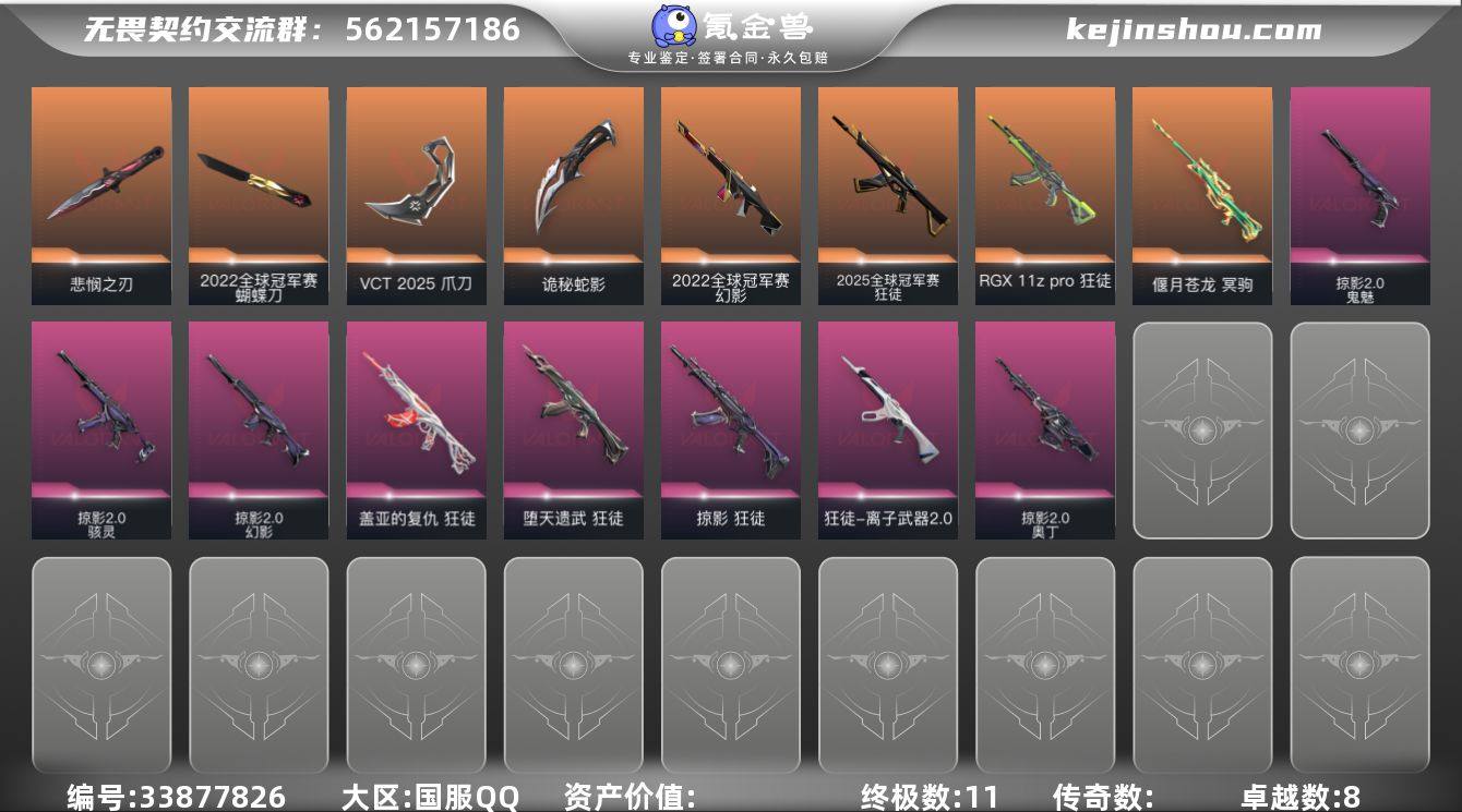 【套装】:2022全球冠军赛套装,无畏契约季前邀请赛套装,VCT 2025 赛季套装,掠影//2.0套装 【英雄】:幻棱,炼狱,维斯,暮蝶,钛狐,壹决,铁臂,捷风,雷兹,幽影,不死鸟,贤者,猎枭,蝰蛇,零,芮娜,奇乐,尚勃勒,霓虹,斯凯,夜露,星礈,K/O,海神,盖可,黑梦,钢锁 【近战武器】:近战武器-2022全球冠军赛 蝴蝶刀,近战武器-无畏契约季前邀请赛 悲悯之刃,近战武器-影钩,近战武器-VCT 2025 爪刀,近战武器-紫金爪刀,近战武器-黑波之刃,近战武器-诡秘蛇影 军刀 【狂徒】:狂徒-2025全球冠军赛,狂徒-RGX 11z Pro,狂徒-堕天遗武,狂徒-掠影,狂徒-盖亚的复仇,狂徒-离子武器//2.0,狂徒-诡秘蛇影 【幻影】:幻影-2022全球冠军赛,幻影-掠影//2.0,幻影-末日之翼 【戍卫】:戍卫-折光棱晶 【冥驹】:冥驹-偃月苍龙 【飞将】:飞将-末日之翼 【莽侠】:莽侠-诡秘蛇影 【奥丁】:奥丁-掠影//2.0,奥丁-末日之翼 【判官】:判官-诡秘蛇影 【骇灵】:骇灵-掠影//2.0,骇灵-无限竞技 【蜂刺】:蜂刺-折光棱晶 【标配】:标配-折光棱晶 【正义】:正义-超限闪存,正义-纳米打击 【鬼魅】:鬼魅-掠影//2.0,鬼魅-诡秘蛇影,鬼魅-星云暗涌 【狂怒】:狂怒-蒙太奇 【短炮...