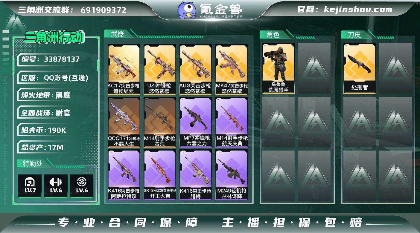 【SJZS1772】总资产17M/哈夫币19万/传说近战数1/传说枪皮数6/战场等级33/行动等级60/安全箱等时效性道具以游戏内数据为准,详情请看图/乌鲁鲁-荒原猎手/近战-处刑者/近战-黑鹰/KC17突击步枪-造物纪元/KC17突击步枪-造物纪元(优品S)/AUG突击步枪-悠然茶歇/MK47突击步枪-悠然茶歇/UZI冲锋枪-悠然茶歇/QCQ171冲锋枪-不羁人生/M14射手步枪-蛮荒/K416突击步枪-红色彗星/K416突击步枪-腊梅/K416突击步枪-阿萨拉特攻/K437突击步枪-丛林谍踪/SR-3M紧凑突击步枪-开工大吉/勇士冲锋枪-丛林谍踪/MP7冲锋枪-六套之力/M249轻机枪-丛林谍踪/QJB201轻机枪-炽焰/VSS射手步枪-丛林谍踪/M14射手步枪-航天庆典/AKS-74U突击步枪-休闲时光/M7战斗步枪-精英联盟/SG552突击步枪-马年新春/SG552突击步枪-贴花艺术/ AK-12突击步枪-马年新春/G3战斗步枪-猛禽/CAR-15突击步枪-来财/KC17突击步枪-精英联盟/KC17突击步枪-来财/SMG-45冲锋枪-行动开启/SMG-45冲锋枪-幻影结构/SR-3M紧凑突击步枪-马年新春/M1014霰弹枪-幻影结构/QJB201轻机枪-哈夫克卫队/Mini-14射手步枪-来财/AWM狙击步枪-精英联盟/QSZ92G-一帆风顺/SMG-45冲锋枪-斑马/G17-斑马/G3战斗步枪-猎豹图案/M4A1突击步枪-粉色涂装/QBZ95-1突击步枪-高...