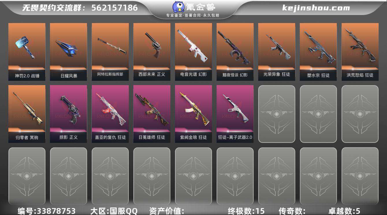 【PTWW4130】LV等级150/皮肤总价值36850/段位青铜/总皮肤数量50/刀皮数量8/枪皮数量42/具体详情请看图/幻棱/炼狱/维斯/暮蝶/钛狐/壹决/铁臂/捷风/雷兹/幽影/不死鸟/贤者/猎枭/蝰蛇/零/芮娜/奇乐/尚勃勒/霓虹/斯凯/夜露/星礈/K/O/海神/盖可/黑梦/钢锁/影钩/神之刃/落英飞旋/镭切/夜刃诡镰/神罚2.0 战锤/日耀风暴/阿特拉斯指挥部/狂徒-洪荒怒焰/狂徒-塑水宗/狂徒-光荣异象/狂徒-盖亚的复仇/狂徒-日冕雄师/狂徒-紫阙金琅/狂徒-离子武器2.0/狂徒-神罚//2.0/幻影-黯夜怪谈/幻影-电音光谱/冥驹-归零者/正义-西部未来/正义-掠影/鬼魅-诡秘蛇影/鬼魅-星云暗涌/狂怒-蒙太奇/逆冲蛮牛 卡面/《双城之战》拥抱 卡面/精灵大战 卡面/欢迎来到底城 卡面/南瓜盛典 卡面/VCT CN首冠 卡面/唱片的故事 卡面/修车达人 卡面/热舞环节 卡面/正义的化身 卡面/超能偶像 卡面/树懒大作战 卡面/源能反应 卡面/纤云弄巧 卡面/零点嗅探设计图 卡面/表象之下 卡面/无畏契约GO!第一卷:芮娜 卡面/清除名单 卡面/无畏契约GO!第一卷:零 卡面/《双城之战》金克丝 卡面/钢锁vs盖可 卡面/别冒尖 卡面/代号红色 卡面/新兵报到 卡面/V契约 卡面/无畏契约 卡面/请求重启 喷漆/纳米打击 喷漆/嗨宝南瓜灯 喷漆/嘭!...
