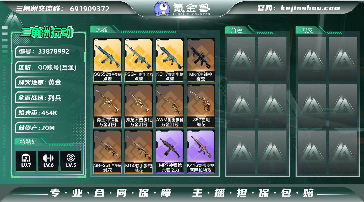 【PTSJZ4917】总资产20M/哈夫币45万/传说枪皮数10/战场等级11/行动等级50/安全箱等时效性道具以游戏内数据为准,详情请看图/近战-黑鹰/SG552突击步枪-点翠/腾龙突击步枪-万金泪冠/KC17突击步枪-点翠/勇士冲锋枪-万金泪冠/MK4冲锋枪-夜莺/M14射手步枪-缄花/SR-25射手步枪-缄花/PSG-1射手步枪-点翠/AWM狙击步枪-万金泪冠/.357左轮-缄花/K416突击步枪-冬日风情/K416突击步枪-阿萨拉特攻/SG552突击步枪-哈夫克警备/MP7冲锋枪-六套之力/PKM通用机枪-蝮蛇/SV-98狙击步枪-囚徒/M700狙击步枪-哈夫克警备/沙漠之鹰-曙光/AKM突击步枪-精英联盟/K416突击步枪-一帆风顺/SG552突击步枪-2026/SG552突击步枪-贴花艺术/MP5冲锋枪-弄臣/MP5冲锋枪-哈夫克卫队/SMG-45冲锋枪-行动开启/勇士冲锋枪-冰天雪地/M249轻机枪-冰天雪地/QSZ92G-一帆风顺/M4A1突击步枪-粉色涂装/M4A1突击步枪-海色/QBZ95-1突击步枪-海色/QBZ95-1突击步枪-2026/K416突击步枪-高雅黑/M7战斗步枪-红色涂装/M7战斗步枪-黑巧甜心/SG552突击步枪-海浪/SG552突击步枪-狂欢/SCAR-H战斗步枪-数码迷彩/G3战斗步枪-高雅黑/PTR-32突击步枪-黄蜂/AS Val突击步枪-黑巧甜心/MP5冲锋枪-黄蜂/P90冲锋枪-黑巧甜心/UZI冲锋枪-海色/UZI冲锋枪-狂...