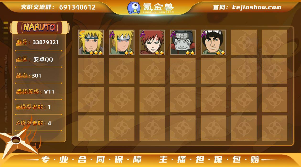 1S级忍者数-4A级忍者数 【S级忍者】:波风水门(3星) 【A级忍者】:波风水门「青年」(2星),干柿鬼鲛(2星),迈特凯(2星),我爱罗「疾风传」(2星)