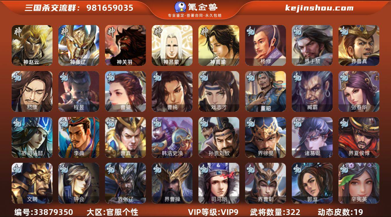 【JYSGS404】官阶:大将军 VIP等级:VIP9级 史诗武将数:34 动态皮肤数:19 武将总数:322 史诗宝珠数:40 元宝数:4169 将魂数:5535 /神赵云/神张辽/界于禁/界曹真/嵇康/程昱/戏志才/杨修/曹婴/曹纯/王平/诸葛瞻/谋马超/谋赵云/花鬘/界黄忠/马云騄/沙摩柯/谯周/谋孙策/界徐盛/界朱然/贺齐/左慈/许攸/谋张角/杜预/沮授/界李儒/公孙康/兀突骨/祢衡/星黄忠/星董卓/蒯越蒯良/王基/谋徐晃/谋于禁/卞夫人/华歆/袁涣/崔琰/界曹操/界司马懿/界夏侯惇/界张辽/界许褚/界郭嘉/界甄姬/界典韦/界荀彧/界徐晃/界曹丕/界邓艾/张春华/钟会/曹冲/郭淮/满宠/曹真/韩浩史涣/陈群/曹叡/钟繇/界王异/界曹彰/界郭淮/孙资刘放/辛宪英/诸葛诞/曹昂/SP关羽/SP姜维/文聘/乐进/司马朗/李通/李典/吕虔/鲁芝/阮慧/朱灵/董昭/臧霸/骥李典/华雄/袁术/仲帝袁术/谋刘赪/谋华雄/荀谌/羊祜/孔融/朱儁/界华佗/界吕布/界袁术/界貂蝉/界张角/界于吉/界庞德/界颜良文丑/界袁绍/公孙瓒/伏皇后/李儒/蔡夫人/公孙渊/界高顺/界公孙瓒/刘虞/蔡邕/伏完/张宝/SP赵云/刘协/SP黄月英/严白虎/蹋顿/张鲁/刘琦/董承/樊稠/SP太史慈/刘繇/李傕/张梁/胡车儿/阎圃/王濬/韩遂/李傕郭汜/星张辽/星张郃/神关羽/神吕蒙/神周瑜/严颜/陈到/势陈祗/...