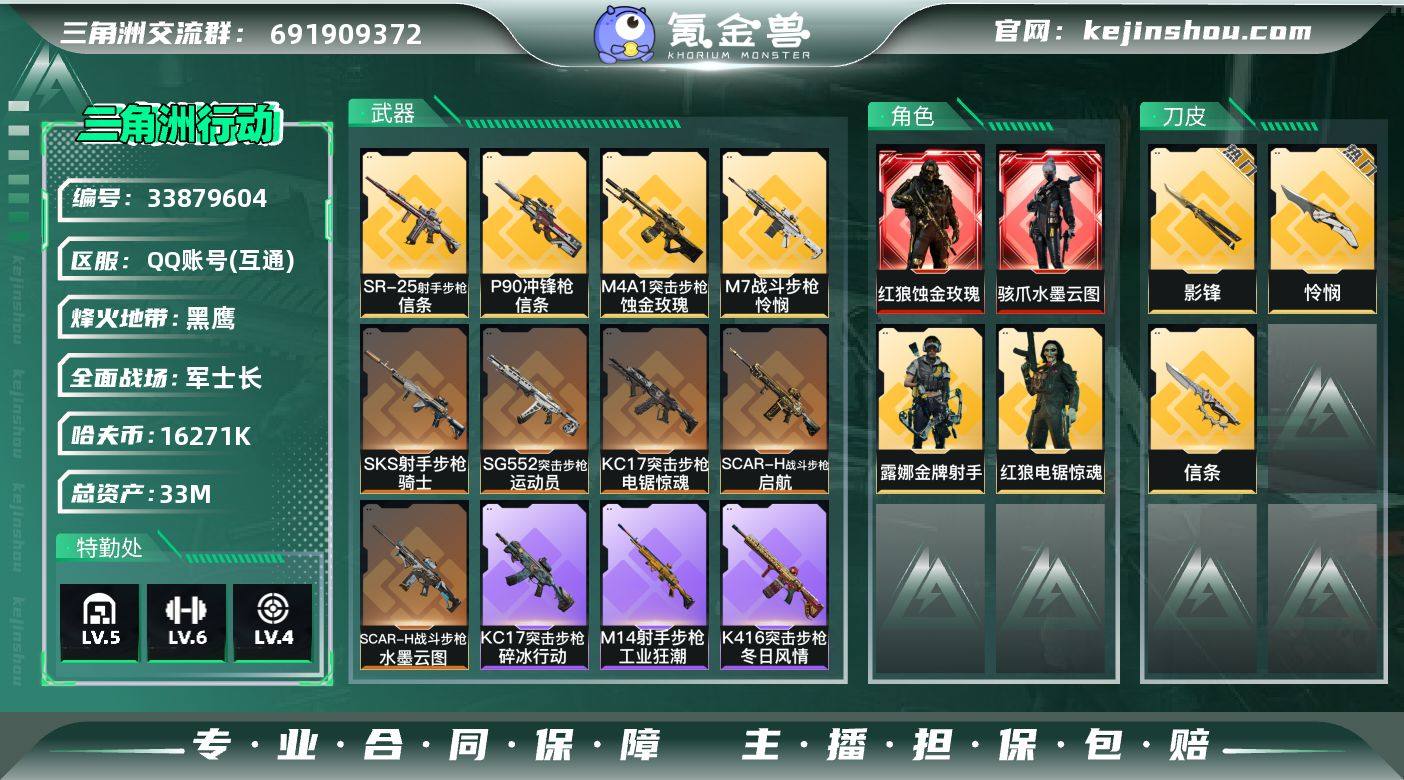 【热门皮肤号:双红+三刀皮-蚀金玫瑰+水墨云图+信条+影锋+怜】【Q区三端互通】【无二次】YXz8293-特勤处:仓库5级/靶场4级/训练中心6级-总资产33.5m-哈夫币1627w-烽火等级:60级 【干员外观】:红狼-蚀金玫瑰,骇爪-水墨云图,红狼-电锯惊魂,露娜-金牌射手 【近战皮肤】:近战-信条,近战-影锋,近战-怜悯,近战-黑鹰 【传说外观】:M4A1突击步枪-蚀金玫瑰,M7战斗步枪-怜悯,SG552突击步枪-运动员,SCAR-H战斗步枪-水墨云图,SCAR-H战斗步枪-启航,KC17突击步枪-电锯惊魂,P90冲锋枪-信条,SKS射手步枪-骑士,SR-25射手步枪-信条 【史诗外观】:KC17突击步枪-碎冰行动*2,K416突击步枪-冬日风情,M7战斗步枪-百步穿杨,G3战斗步枪-流沙送葬,AS Val突击步枪-百步穿杨,腾龙突击步枪-猎鳄行动,MP5冲锋枪-战术竞备,MP5冲锋枪-竞技风,Vector冲锋枪-百步穿杨,勇士冲锋枪-工业狂潮,PKM通用机枪-蝮蛇,M250通用机枪-囚徒,QJB201轻机枪-炽焰,M14射手步枪-工业狂潮,M700狙击步枪-竞技风,M700狙击步枪-百步穿杨,M700狙击步枪-哈夫克警备,AWM狙击步枪-流沙送葬,沙漠之鹰-曙光 【稀有外观】:PKM通用机枪-黑潮,M7战斗步枪-天际线,AS Val突击步枪-地平线,SCAR-H战斗步枪-...