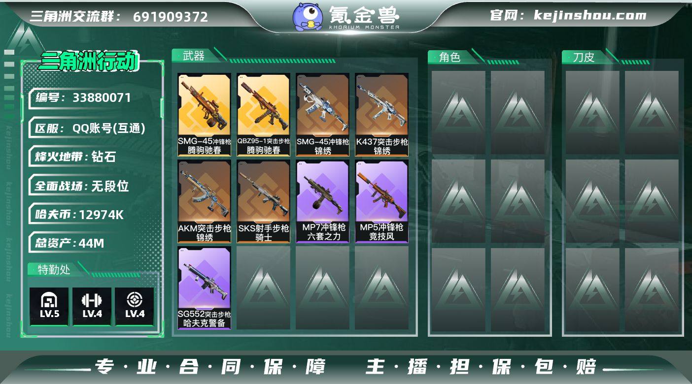 44m总资产-12974k哈夫币-60烽火等级-钻石-1战场等级-无军衔ws0150 【近战皮肤】:近战-黑鹰 【传说外观】:AKM突击步枪-锦绣,QBZ95-1突击步枪-腾驹驰春,K437突击步枪-锦绣,SMG-45冲锋枪-锦绣,SMG-45冲锋枪-腾驹驰春,SKS射手步枪-骑士 【史诗外观】:SG552突击步枪-哈夫克警备,MP5冲锋枪-竞技风,MP7冲锋枪-六套之力,QJB201轻机枪-炽焰 【稀有外观】:AKM突击步枪-肃杀,SG552突击步枪-2026,SG552突击步枪-贴花艺术, AK-12突击步枪-马年新春,腾龙突击步枪-冰天雪地,MP5冲锋枪-弄臣,UZI冲锋枪-前沿科技,野牛冲锋枪-前沿科技,SMG-45冲锋枪-行动开启,勇士冲锋枪-冰天雪地,SR-25射手步枪-开拓 【普通外观】:M4A1突击步枪-粉色涂装,QBZ95-1突击步枪-2026,K416突击步枪-高雅黑,M7战斗步枪-黑巧甜心,G3战斗步枪-高雅黑,AS Val突击步枪-黑巧甜心,P90冲锋枪-黑巧甜心,Vector冲锋枪-几何迷彩,野牛冲锋枪-高雅黑,勇士冲锋枪-磐石,M1014霰弹枪-重击,PKM通用机枪-变色龙,QJB201轻机枪-典雅,SR-25射手步枪-黄蜂,SR-25射手步枪-黑巧甜心,沙漠之鹰-高雅黑,G17-2026 【载具外观】:突击车-赤骅 【挂饰】:挂饰-窃风密探,挂饰-凌霄戍卫,挂饰-崩岩重炮*4,挂饰...