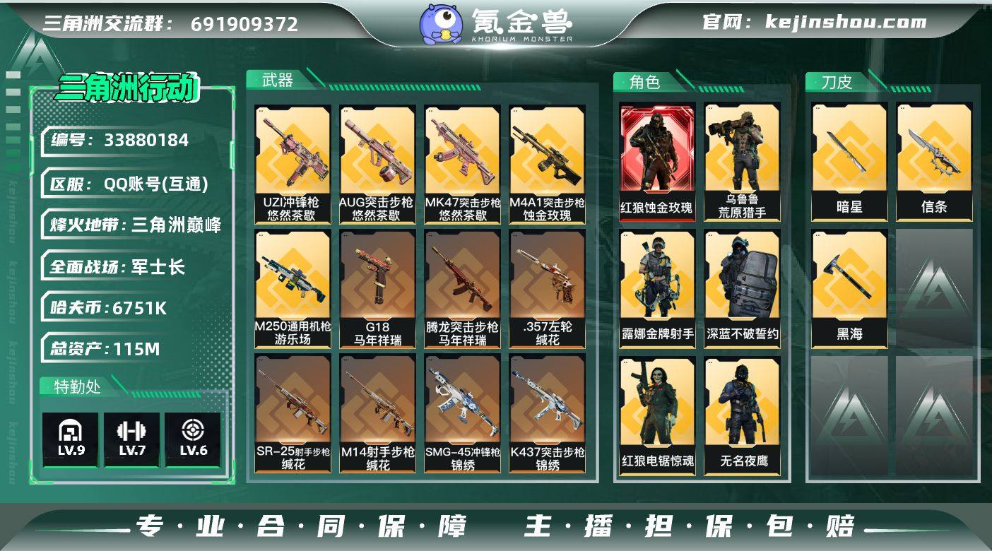 QQA128/可二次/QQ区【115M总资产】+【近战-黑海-暗星-信条-处刑者】+【红狼-蚀金玫瑰】+87AWM子弹】/烽火等级:60级/全面战场:47级/纯币:6751K/三角券加币:390(5三角币+385三角券)【红狼-电锯惊魂】【无名-夜鹰】【乌鲁鲁-荒原猎手】【深蓝-不破誓约】【露娜-金牌射手】//部门:23321/特勤等级(技术中心3级/工作台3级/制药台3级/防具台3级/仓库9级/指挥中心5级/训练中心7级/靶场6级/潜水中心2级/收藏室2级)---(锦绣+悠然茶歇+马年祥瑞+缄花)捆绑包---/橙色挂饰x6/流动资产:42M段位:三角洲巅峰/详细看图