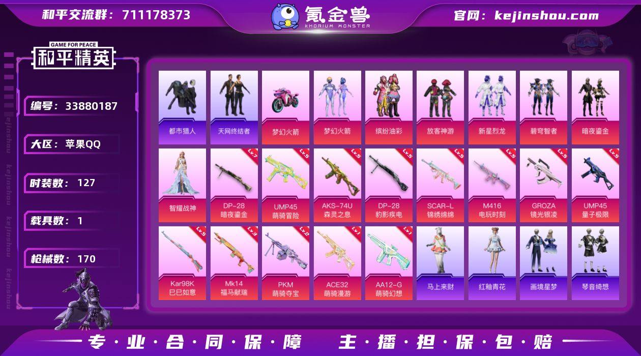 【8398】7粉装-13特效枪-1载具-3粉色飞行器-49805热力值-6王牌印记-127套装-170枪皮 【热门品类】:粉装-梦幻火箭,粉装-缤纷油彩,套装-浪漫天命,套装-都市猎人,套装-小丑鱼,套装-天网终结者,套装-龟仙人,套装-潮萌小黄鸭,套装-暗影哥特,角色-Mark.06,熔岩游骑兵连帽夹克 【粉色套装】:粉装-梦幻火箭,粉装-缤纷油彩,粉装-放客神游,粉装-新星烈龙,粉装-碧穹智者,粉装-暗夜鎏金,角色-智耀战神 【粉色枪皮等级】:SCAR-L-锦绣绵绵(五级),M416-电玩时刻(五级),GROZA-镜光银凌(五级),ACE32-萌骑漫游(一级),UMP45-量子极限(五级),UMP45-萌骑冒险(五级),AKS-74U-森灵之息(五级),Kar98K-巳巳如意(五级),Mk14-福马献瑞(三级),AA12-G-萌骑幻想(一级),DP-28-暗夜鎏金(七级),DP-28-豹影疾电(五级),PKM-萌骑夺宝(二级) 【粉色载具】:双人摩托-梦幻火箭