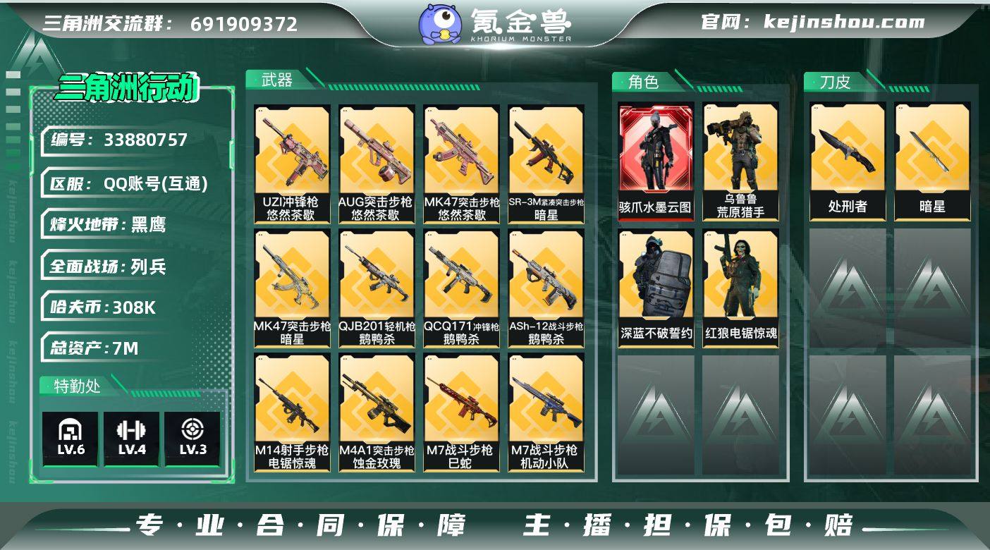 【sjz6461】7m总资产-308k哈夫币-60烽火等级-黑鹰-22战场等级-列兵 【干员外观】:骇爪-水墨云图,深蓝-不破誓约,红狼-电锯惊魂,乌鲁鲁-荒原猎手 【近战皮肤】:近战-暗星,近战-处刑者1级,近战-黑鹰 【传说外观】:M4A1突击步枪-蚀金玫瑰,M4A1突击步枪-阿米娅,ASh-12战斗步枪-鹅鸭杀,AUG突击步枪-悠然茶歇,M7战斗步枪-巳蛇,M7战斗步枪-机动小队,AK-12突击步枪-特斯拉线圈,SCAR-H战斗步枪-水墨云图,SCAR-H战斗步枪-启航,G3战斗步枪-骑士,腾龙突击步枪-捞点薯条,KC17突击步枪-电锯惊魂,MK47突击步枪-悠然茶歇,MK47突击步枪-暗星,UZI冲锋枪-特斯拉线圈,UZI冲锋枪-悠然茶歇,SR-3M紧凑突击步枪-特斯拉线圈,SR-3M紧凑突击步枪-暗星,勇士冲锋枪-能天使-午夜邮差,QCQ171冲锋枪-鹅鸭杀,M250通用机枪-骑士之心,QJB201轻机枪-鹅鸭杀,M14射手步枪-电锯惊魂,M14射手步枪-蛮荒,M14射手步枪-缄花,SR-25射手步枪-缄花,R93狙击步枪-维什戴尔,AWM狙击步枪-捞点薯条,.357左轮-缄花,93R-捞点薯条 【史诗外观】:AKM突击步枪-林中猎手,ASh-12战斗步枪-无极限,K416突击步枪-腊梅,K416突击步枪-阿萨拉特攻,M16A4突击步枪-竞赛选手,AUG突击步枪-蝮蛇,SG552突击...