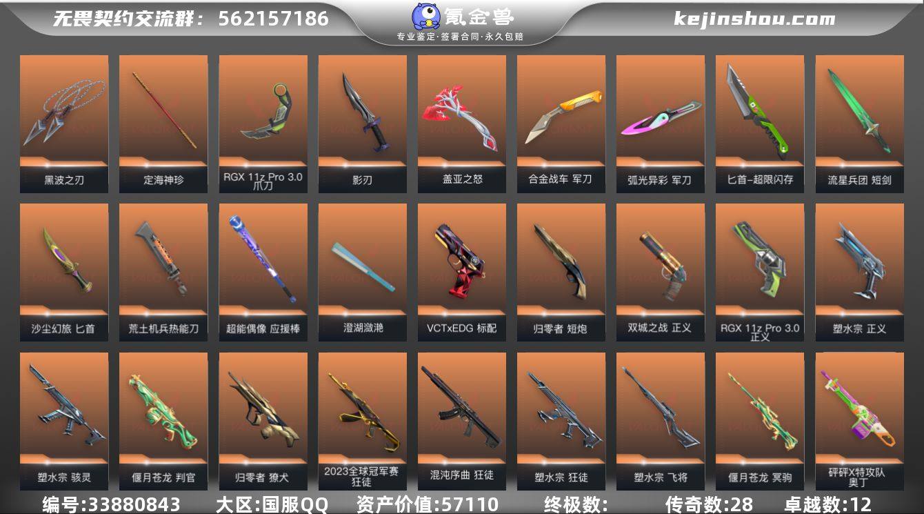 段位: 铂金 亮点皮肤: 正义-双城之战,狂徒-2023全球冠军赛 套装: 盖亚的复仇套装,塑水宗套装,RGX 11z Pro//3.0套装,掠影套装,VCT 2026队伍礼包 近战武器皮肤: 军刀-合金战车,盖亚之怒-盖亚的复仇,军刀-弧光异彩,澄湖潋滟,匕首-沙尘幻旅,定海神珍-盖世英雄,黑波之刃-塑水宗,军刀-流星军团错误,超能偶像 应援棒,爪刀-RGX 11z Pro 3.0,短剑-流星兵团,匕首-超限闪存,影刃-掠影,荒土机兵热能刀 步枪皮肤: 狂徒-紫阙金琅,戍卫-盖亚的复仇,狂徒-盖亚的复仇,幻影-侦察力量,獠犬-归零者,狂徒-塑水宗,狂徒-海洋之星,狂徒-混沌序曲,狂徒-掠影,戍卫-掠影 佩枪皮肤: 鬼魅-盖亚的复仇,短炮-归零者,正义-塑水宗,标配-VCTxEDG,正义-RGX 11z Pro 3.0,正义-掠影 狙击枪皮肤: 冥驹-无垠星环,飞将-盖亚的复仇,冥驹-偃月苍龙,飞将-塑水宗,莽侠-RGX 11z Pro 3.0,冥驹-掠影 冲锋枪皮肤: 骇灵-塑水宗 霰弹枪皮肤: 判官-偃月苍龙 机枪皮肤: 奥丁-砰砰X特攻队 亮点: 【优质装备】:塑水宗套装,盖亚的复仇套装,掠影套装,RGX 11z Pro//3.0套装,正义-双城之战,冥驹-偃月苍龙,狂徒-2023全球冠军赛,狂徒-塑水宗,狂徒-混沌序曲,狂徒-掠影,狂徒-紫阙金琅,狂徒-盖亚的复仇,幻影-侦察力量,獠犬-归零者,正义-塑水宗,...