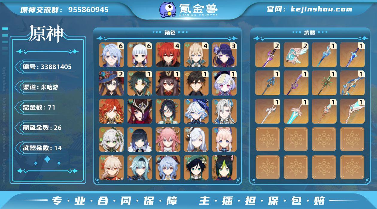 邮箱: 不送邮/死邮 总黄数: 71 冒险等级: 60 6命金色角色: 满命神里绫华,满命神里绫人 4命金色角色: 四命迪卢克,四命琴 3命金色角色: 三命雷电将军 2命金色角色: 二命莫娜 1命金色角色: 一命七七,一命钟离,一命魈,一命胡桃 0命金色角色: 温迪,枫原万叶,优菈,刻晴,甘雨,珊瑚宫心海,申鹤,八重神子,夜兰,提纳里,纳西妲,那维莱特,芙宁娜,闲云,恰斯卡,玛薇卡 拥有武器: 天空之翼,雾切之回光,天空之卷,和璞鸢,天空之傲,风鹰剑,天空之脊,薙草之稻光,终末嗟叹之诗,息灾,波乱月白经津,静水流涌之辉 2精武器: 雾切之回光,天空之卷 1精武器: 天空之翼,和璞鸢,天空之傲,风鹰剑,天空之脊,薙草之稻光,终末嗟叹之诗,息灾,波乱月白经津,静水流涌之辉
