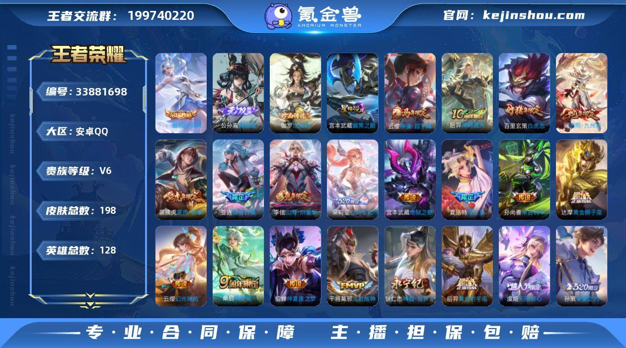 精品皮肤号,,限定多多,,6王者印记,,12,按键,,,1星传说,,夺宝次数161,,,五级铭文150级,,亲密度道具 安卓Q-V6-最强王者段位-128英雄-198皮肤-1典藏皮肤-1无双-1珍品传说-22传说-62史诗 【英雄全皮】:孙权全皮,苍全皮,敖隐全皮,夏洛特全皮 【荣耀典藏】:伽罗最初的交响 【无双皮肤】:公孙离离恨烟 【珍品传说】:伽罗沧流箭 【传说皮肤】:云缨神骥越千峰,后羿神树通天,澜愿照九州拓,云缨幻光神枪,桑启鸣野蒿,朵莉亚心动手记,亚连落雪白狼,张飞百相守梦,夏洛特浮生妄,虞姬无限倾心,伽罗炽翼辉光,李信山海炽霜斩,狄仁杰神器狴犴令,孙策挚爱之约,裴擒虎寅虎赤拳,干将莫邪久胜战神,达摩黄金狮子座,百里玄策白虎志,后羿黄金射手座,貂蝉仲夏夜之梦,孙尚香末日机甲,宫本武藏地狱之眼 【限定皮肤】:公孙离离恨烟,蔡文姬夏日便利店,虞姬夏日便利店,姜子牙天穹之誓,狄仁杰阴阳师,赵云皇家上将,赵云龙胆,妲己时之彼端,周瑜赤莲之焰,元歌无心,马可波罗暗影游猎,马可波罗山海玄木吟,狄仁杰魔术师,狄仁杰神器狴犴令,项羽海滩派对,刘备百相守梦,张飞百相守梦,李元芳银河之约,虞姬无限倾心,百里玄策白虎志,公孙离玉兔公主,裴...